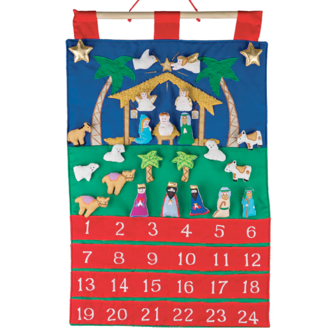 This beautifully crafted Advent calendar comes with velcro affixed stuffed figures that are removed from the pockets and added to the scene each day of Advent. The final Nativity scene depicts the birth of Jesus as the Star of Bethlehem guides you closer to this holy day.