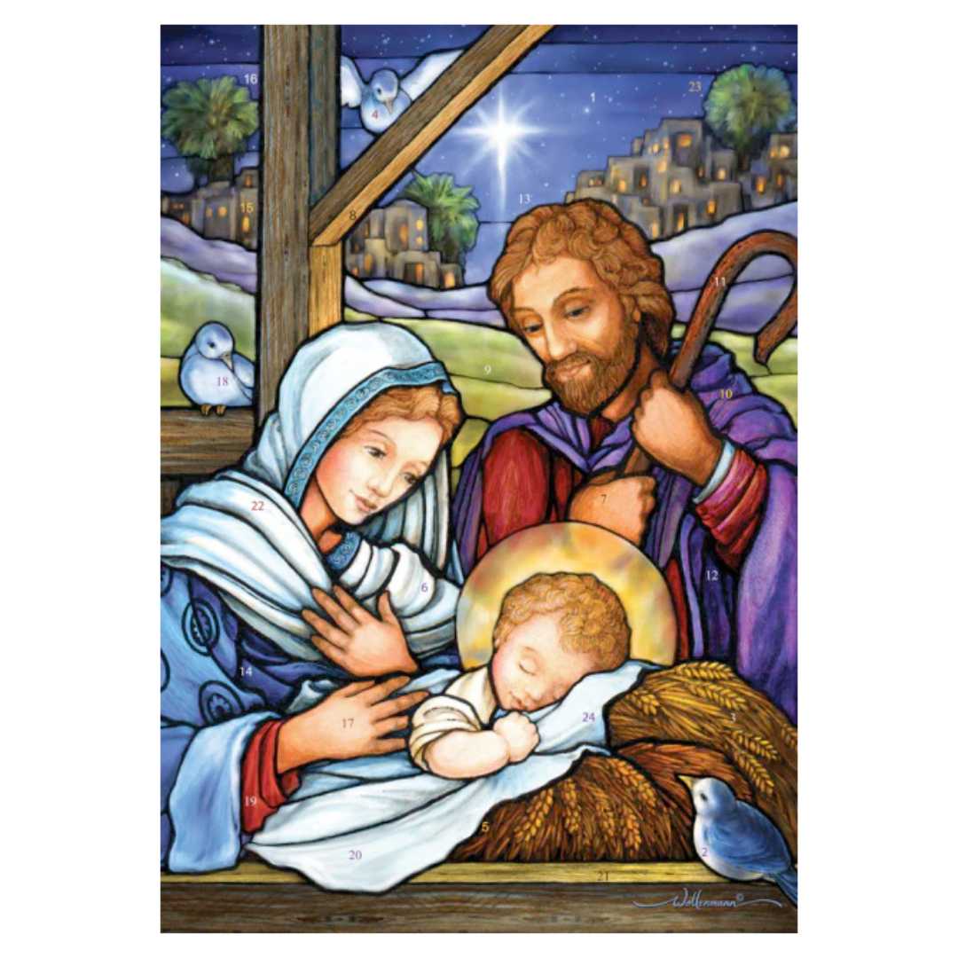Using an Advent calendar is a great family tradition that helps to build the anticipation for Christmas. Prepare for Christmas by opening a window each day during Advent to reveal part of the Nativity story and a corresponding picture. The front is accentuated with glitter. This Advent calendar measures 11 3/4" x 8 1/4". Easy to hang or display anywhere! Artwork by Randy Wollenmann.