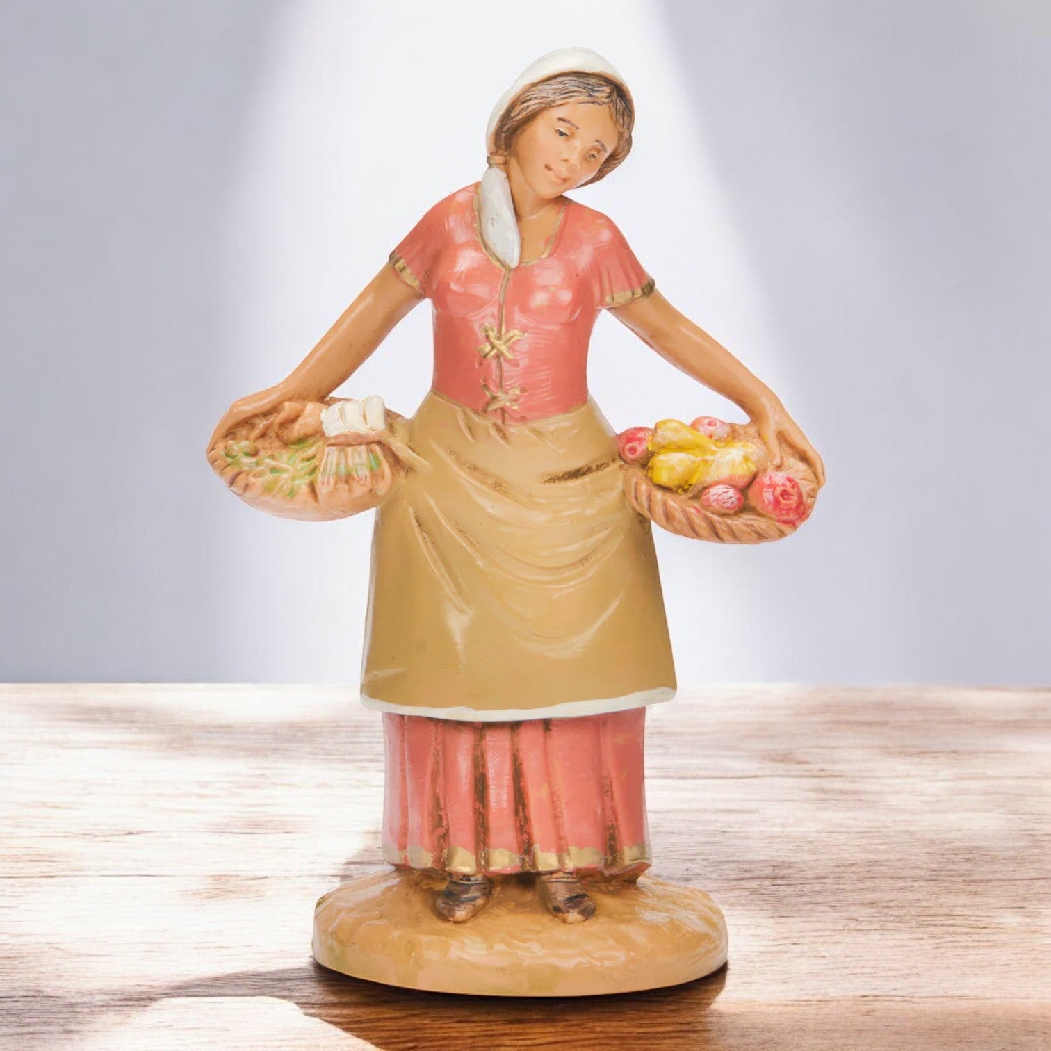 The 5" Scale Antonia the Produce Worker by Fontanini adds a touch of realism and motion to your nativity village. Shown holding two baskets full of vegetables, fruit, and bread, Antonia appears mid-stride, actively contributing to daily life. She is dressed in a warm red blouse and tan apron, with sculpted detailing throughout the goods she carries.