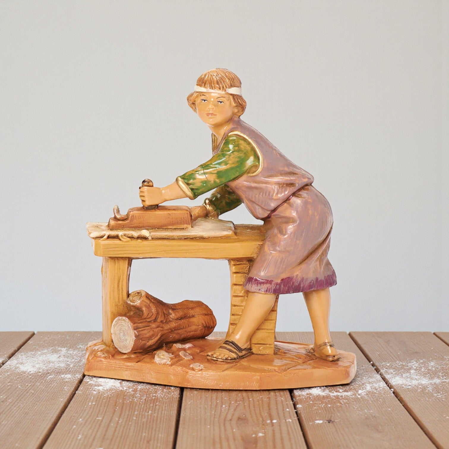 Herschel the Young Carpenter depicts a young boy planing wood at his bench, surrounded by wood shavings and a log at his feet. He wears a green tunic under a mauve apron and leans forward with focus and intent. Inspired by a boy who once dreamed of being a carpenter like his father, Herschel reminds us that small actsš like building a cribš can carry great meaning.