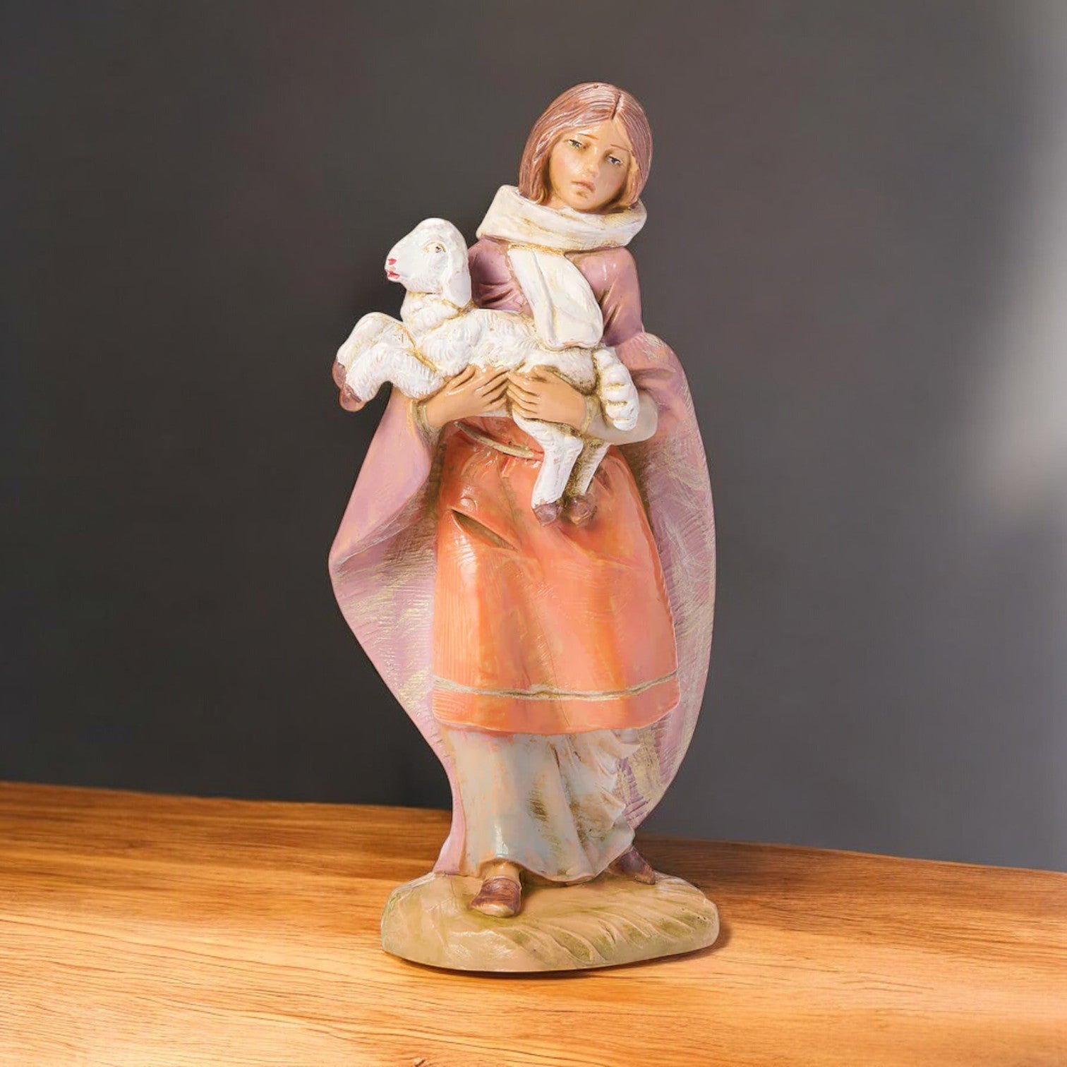 Emma the Shepherdess features a young figure carrying a small lamb in her arms, her robes sculpted in shades of rose, ivory, and sage. She walks forward with calm purpose, reflecting the story of a girl who followed the star to Bethlehem carrying her family™s final lamb, hoping to reunite with her father and brother and to offer a gift to the newborn King.