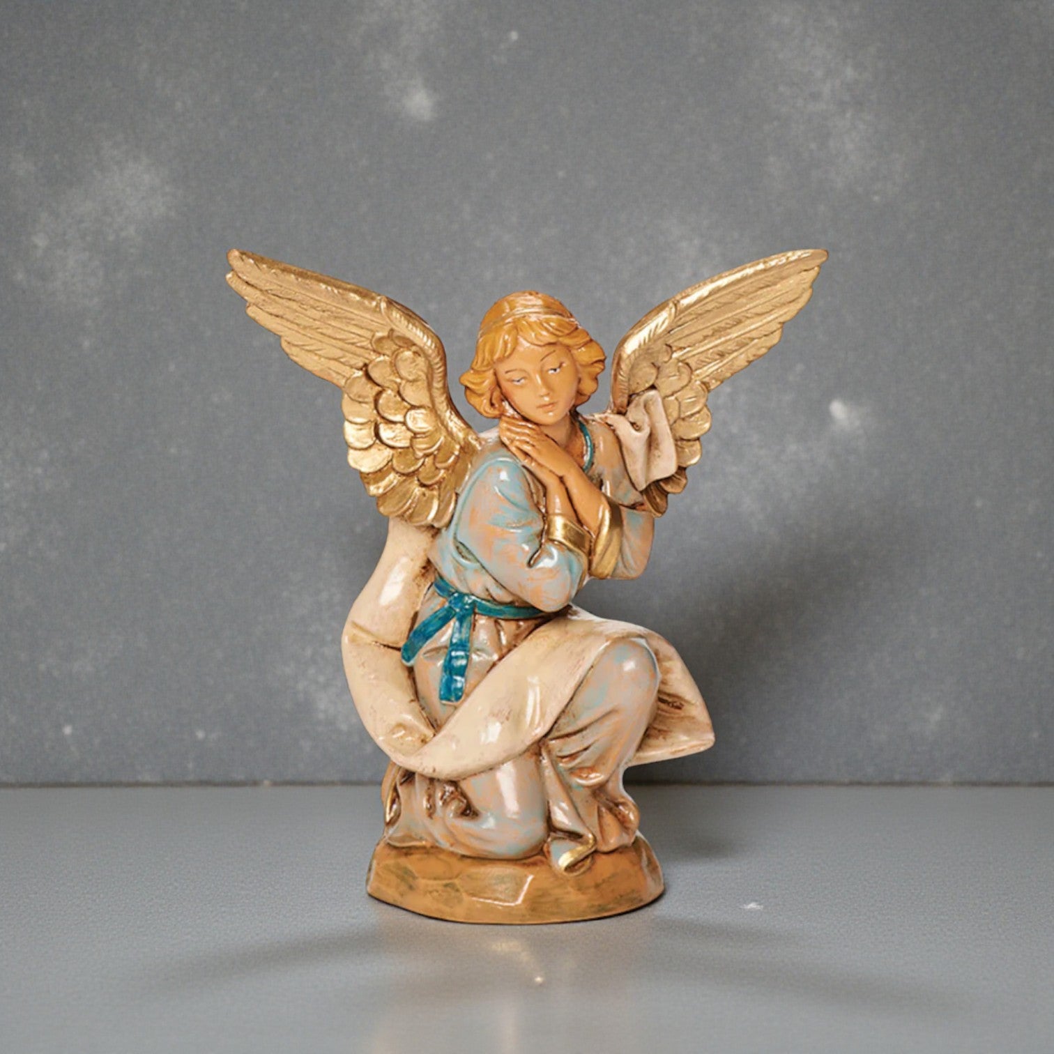 The Kneeling Angel captures a moment of quiet devotion, with hands gently pressed in prayer and wings curved upward in graceful form. Designed to be placed near the Holy Family or as a background figure, this angel embodies watchfulness and reverence.