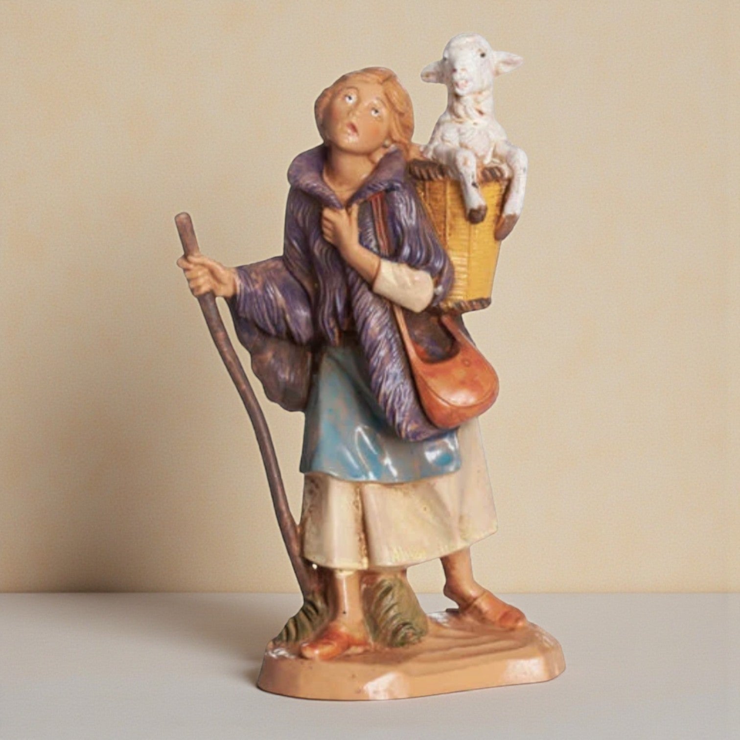 Miriam is depicted carrying a lamb in a woven basket on her back, a shepherd™s staff in hand, and her garments painted in warm earth and violet tones. Her figure reflects the story of a young woman who defied expectation, choosing a life of care and devotion to the animals entrusted to her. With gentle sculpting and expressive detail, Miriam brings a heartfelt layer of storytelling to your nativity.