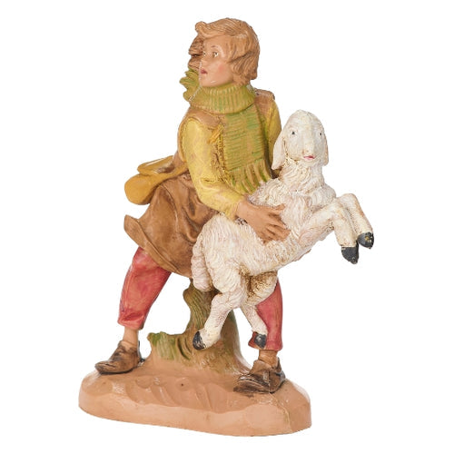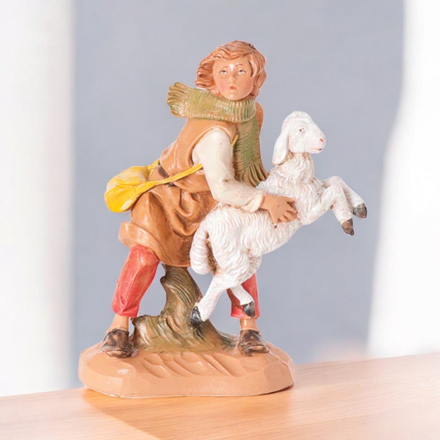 Aaron is shown holding onto a lively sheep, a scene that captures the spirit and energy of youth. His windswept hair and eager expression pair with his yellow tunic, brown vest, and red trousers tucked into worn shoes, while a green scarf and yellow satchel suggest a boy always ready for adventure. Inspired by childhood dreams of desert caravans and wide horizons, this Fontanini figure brings charm and personality to any scene.