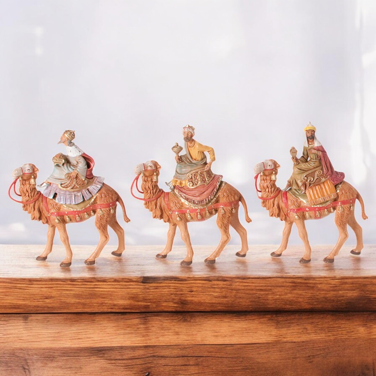 This 3-piece set portrays the Magi on their camels as they journey to honor the newborn King. Each King is permanently mounted on his camel, richly detailed in flowing robes and holding the gifts of gold, frankincense, and myrrh. The sculpted saddles, reins, and textured fur of the camels add depth and authenticity, while the unified design captures the grandeur and reverence of their pilgrimage