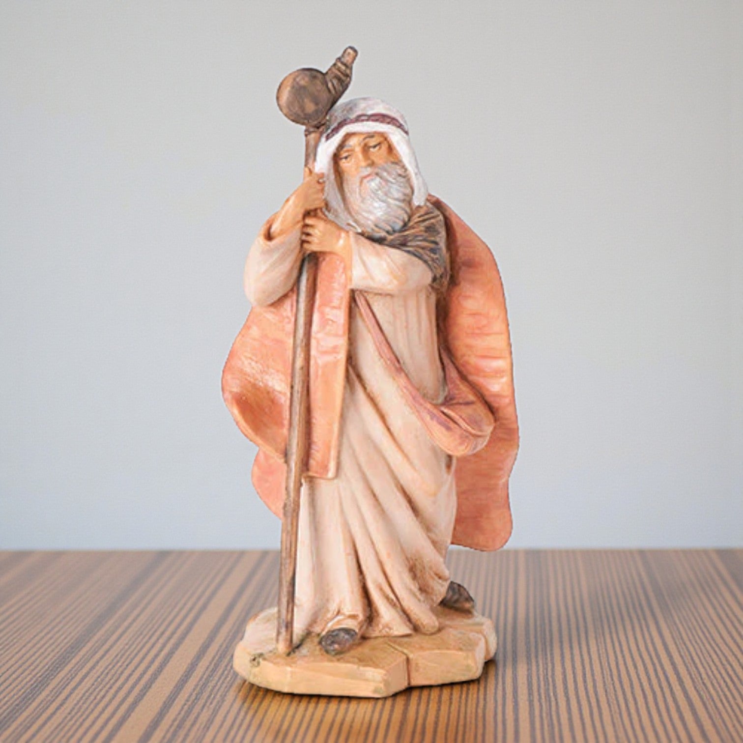 Isaiah the Shepherd adds strength and time-worn character to your nativity display. Isaiah stands with both hands resting on a tall shepherd's staff, his long robe and windswept cloak suggesting a life lived outdoors. His gray beard, attentive expression, and steady posture make him ideal for placement near sheep, fellow shepherds, or along a village path in your collection.