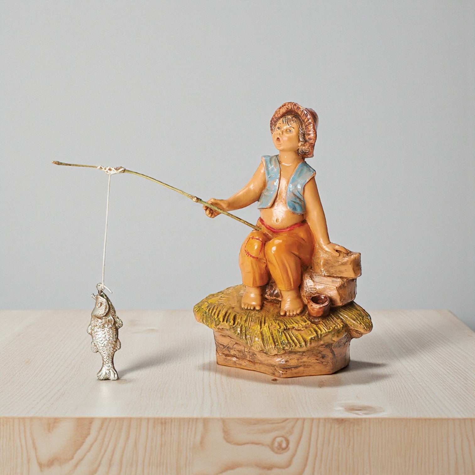 Jada the Fishing Boy is shown seated on a rock, proudly holding a fishing pole with a freshly caught fish at the end. He wears a vest, loose pants, and a brimmed hat, resting barefoot beside a small jug and grassy mound. The removable fishing pole allows for a dynamic display. Inspired by the story of a child whose simple gift of fish helped feed the crowd gathered at the stable, Jada adds both charm and meaning to the Nativity.