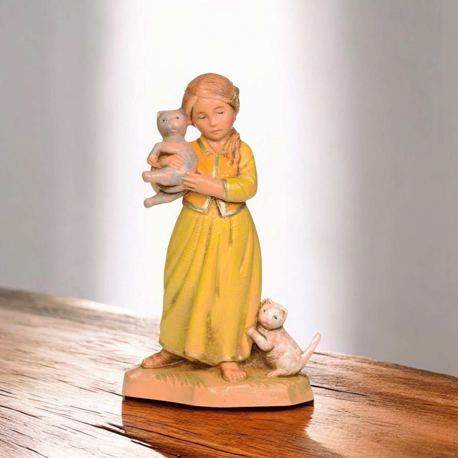 Filia shows a young girl holding her cat Shalom, while another kitten plays at her feet. She is dressed in warm harvest tones, her expression sculpted with lifelike detail. Guided by the instincts of her cat, Filia™s story tells of a simple encounter on the road to Bethlehem, where her kindness offered help to a weary couple. This figure brings a personal touch to the Nativity, reminding us how even the smallest gestures can carry lasting meaning.