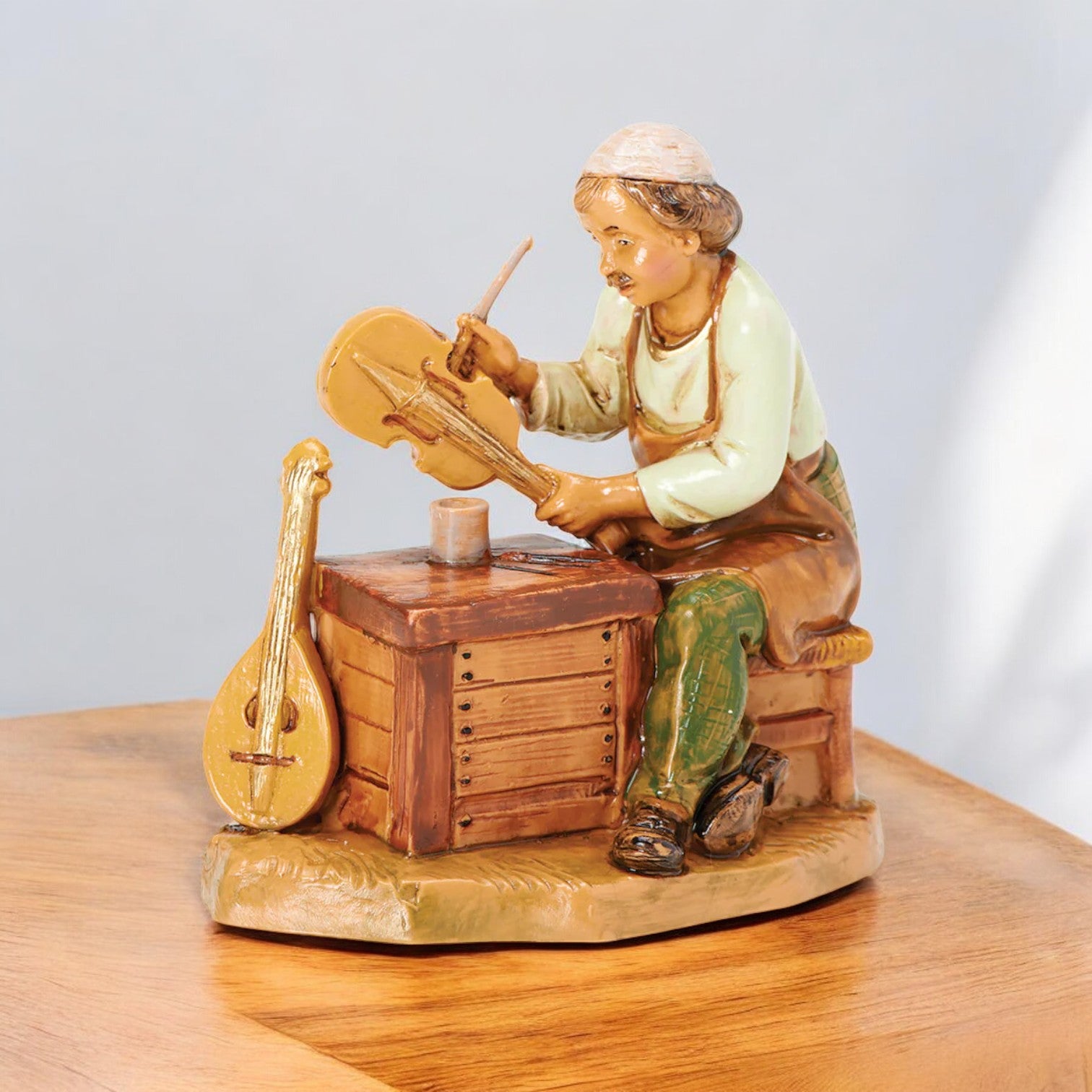 Zimri the Instrument Maker shows a skilled artisan carving a stringed instrument with care at his workbench. A finished mandolin rests beside him, his expression reflecting quiet concentration and love for his craft. Known for teaching children and gifting instruments, Zimri brought joy to Bethlehem, welcoming the Christ Child.