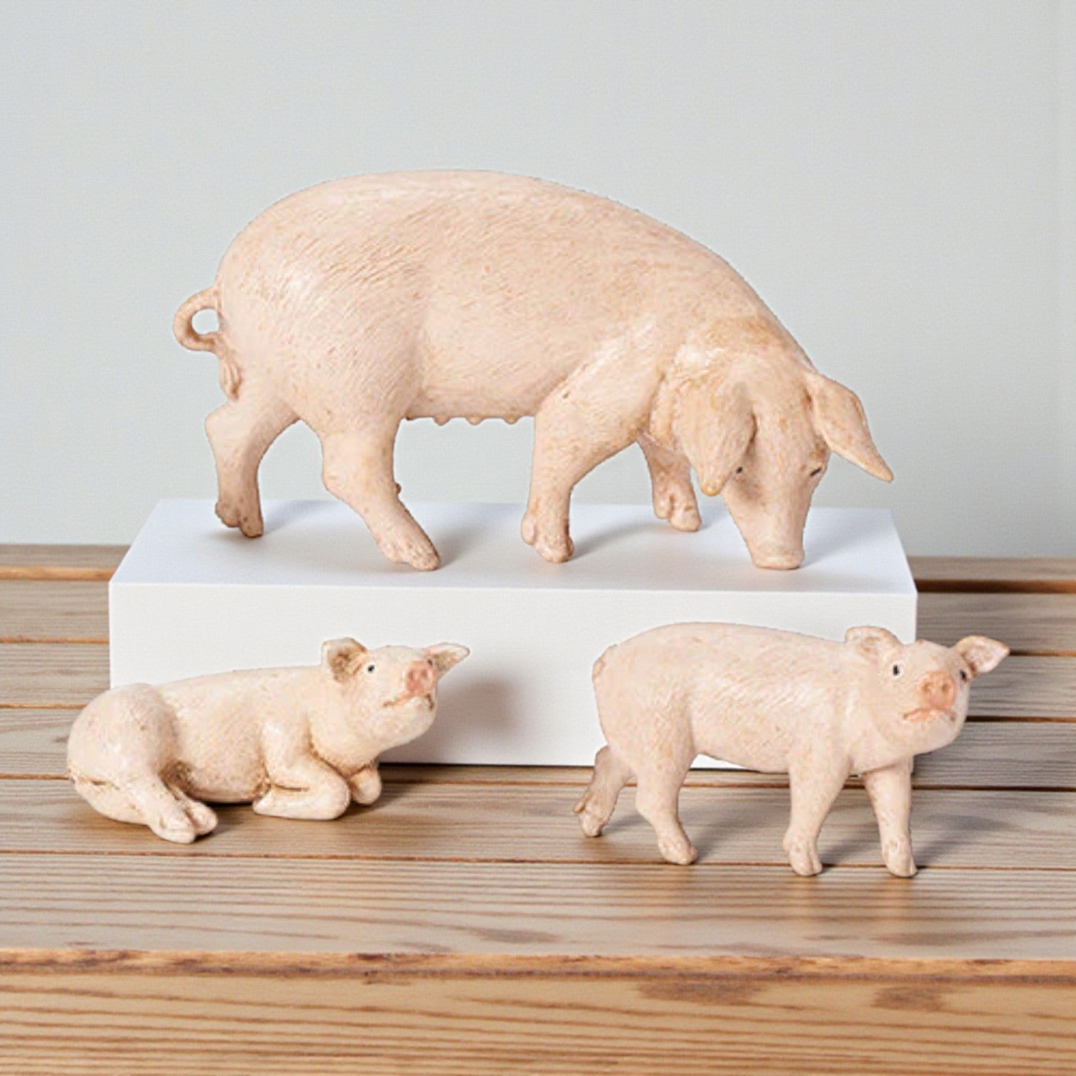 This charming three-piece pig family adds a touch of rustic village life to your collection. The set includes a mother pig, a curious piglet, and a sleeping piglet, each sculpted with lifelike texture and soft pink coloring. Together they bring authenticity, enhancing farmyard scenes and reminding us of the simple everyday life alongside the nativity.