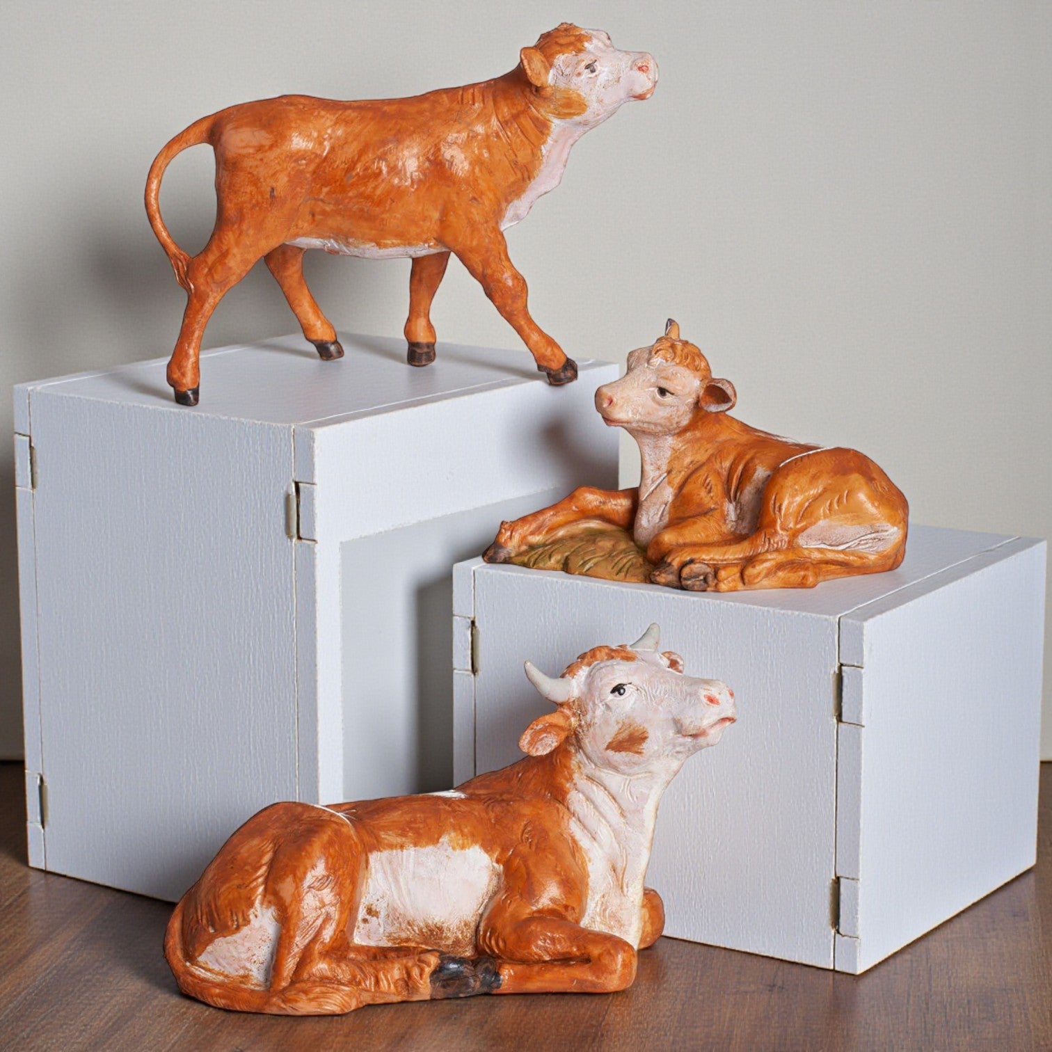 This 3-PC Ox Family Set adds authentic barnyard character to your village scene. This trio includes a standing calf and two seated oxen, each painted in warm brown and white tones with carefully molded coats and gentle facial expressions. Whether paired with shepherds or placed near a stable or shelter, these lifelike figures enhance any nativity display with a quiet rural charm.