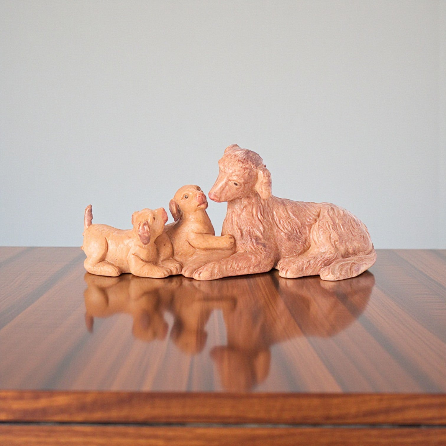This Dog Family set captures a warm scene of a mother resting while her two puppies nuzzle and play at her side. Carefully detailed with lifelike coats and expressive faces, the figures bring movement and personality into the Nativity. Their presence reflects the ordinary animals that would have gathered near the shepherds and stable, grounding the scene in everyday life.