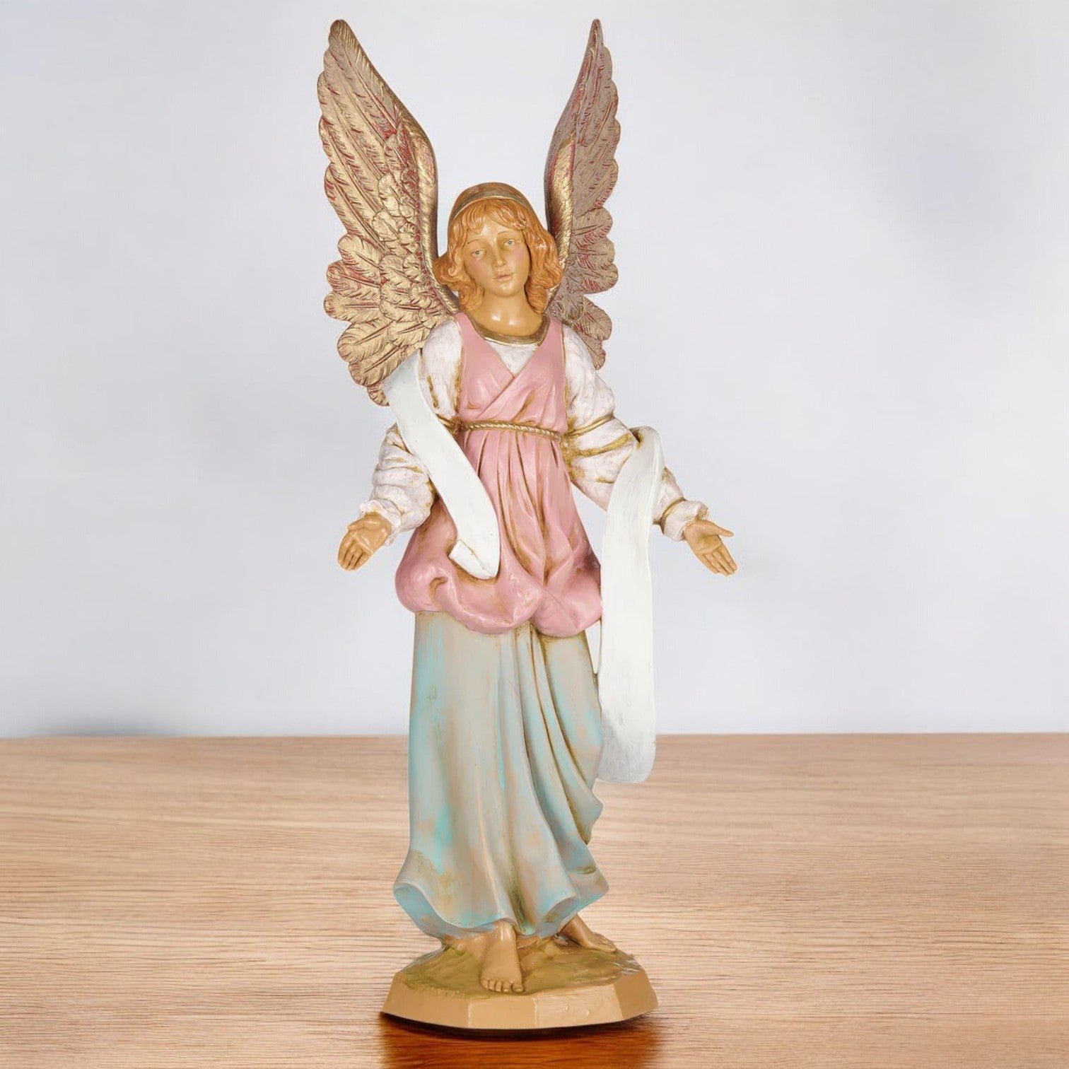 The Standing Angel is a timeless figure in the Nativity, recalling the heavenly messengers who announced Christ™s birth to shepherds in the fields. With outstretched arms and graceful wings, this angel conveys both peace and divine proclamation. The sculpted banner draped across her arms can be imagined carrying the Gloria message, symbolizing the praise that filled the skies over Bethlehem.