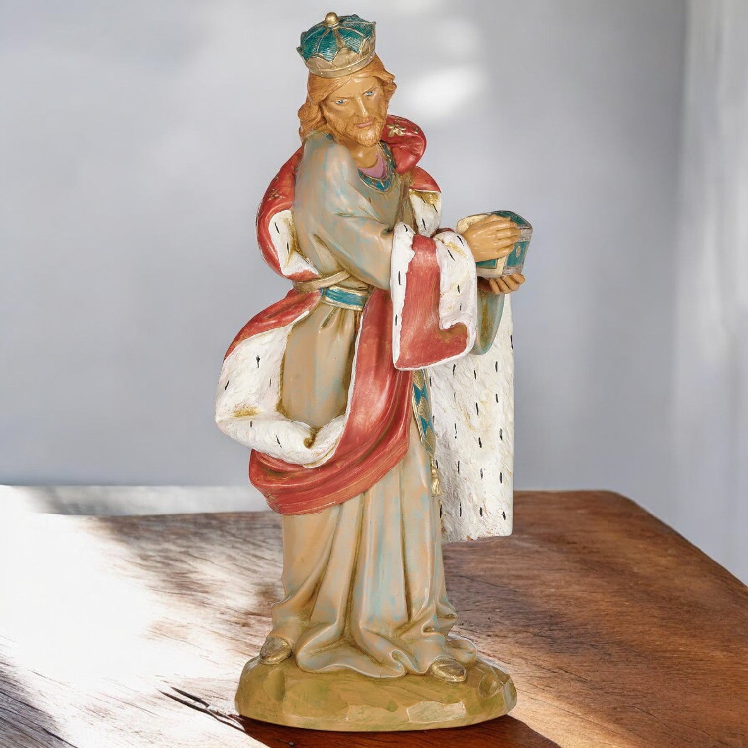 King Melchior is traditionally remembered as the Magi who presented gold to the Christ Child, a gift symbolizing kingship and honor. This figure portrays Melchior in regal robes trimmed with rich detail, a jeweled crown upon his head, and his offering held with reverence. His posture conveys both dignity and humility as he kneels in spirit before the newborn King. Together with Gaspar and Balthazar, Melchior enriches your collection with beauty and meaning, celebrating the Epiphany and the journey of faith that led them to Bethlehem.