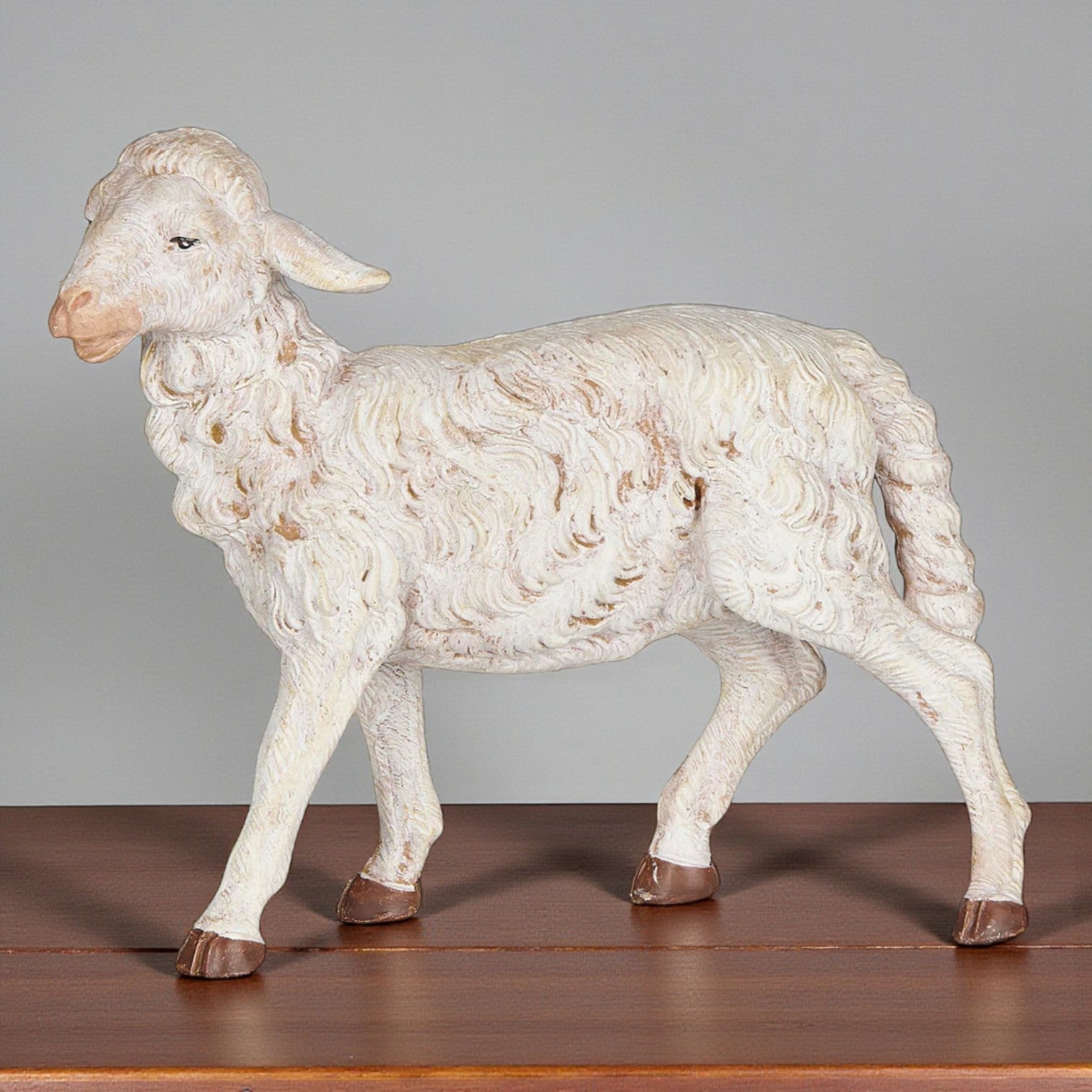 This sheep is sculpted mid-step, its textured wool coat detailed with soft curls and gentle shading for lifelike realism. With an alert yet peaceful stance, it is designed to pair seamlessly with other figures, adding movement and authenticity to larger nativity settings. A classic companion piece that enriches shepherd scenes and completes nativity scenes.