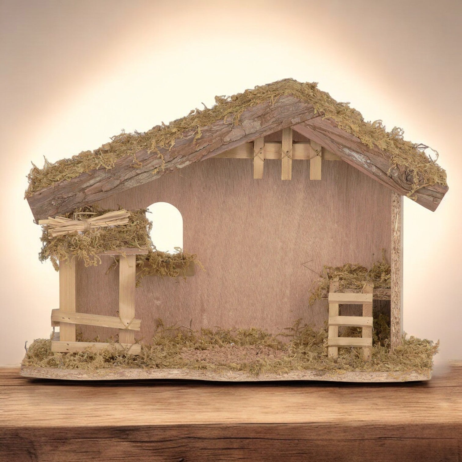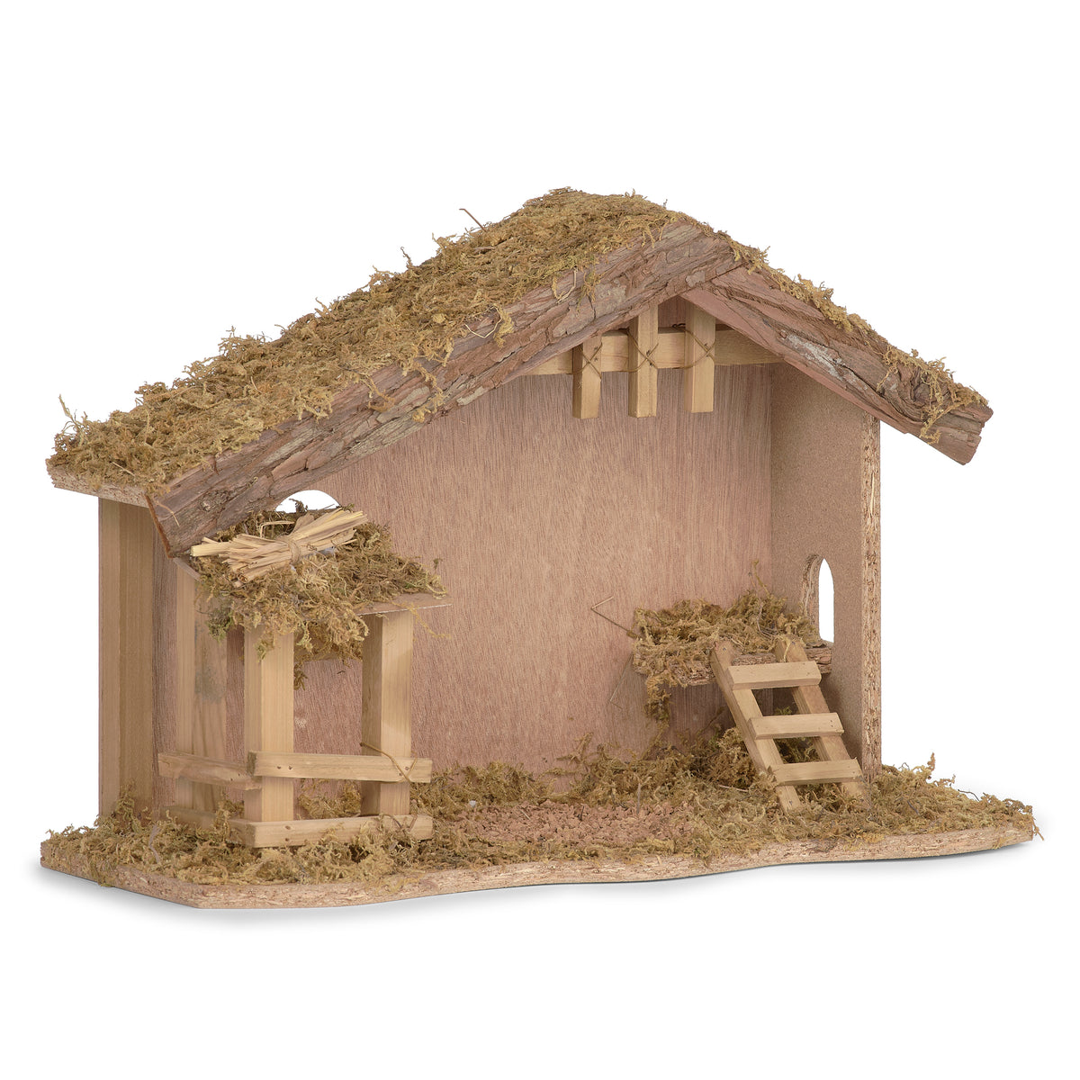 The Rustic Wooden Nativity Stable is crafted with simplicity that feels true to Bethlehem™s countryside. A moss-covered roof and bark accents bring a natural, timeworn look, while the open floor plan allows space for arranging the Holy Family and surrounding figures. A loft, ladder, and arched window detail lend charm to the design, making it feel like a place of quiet shelter and welcome