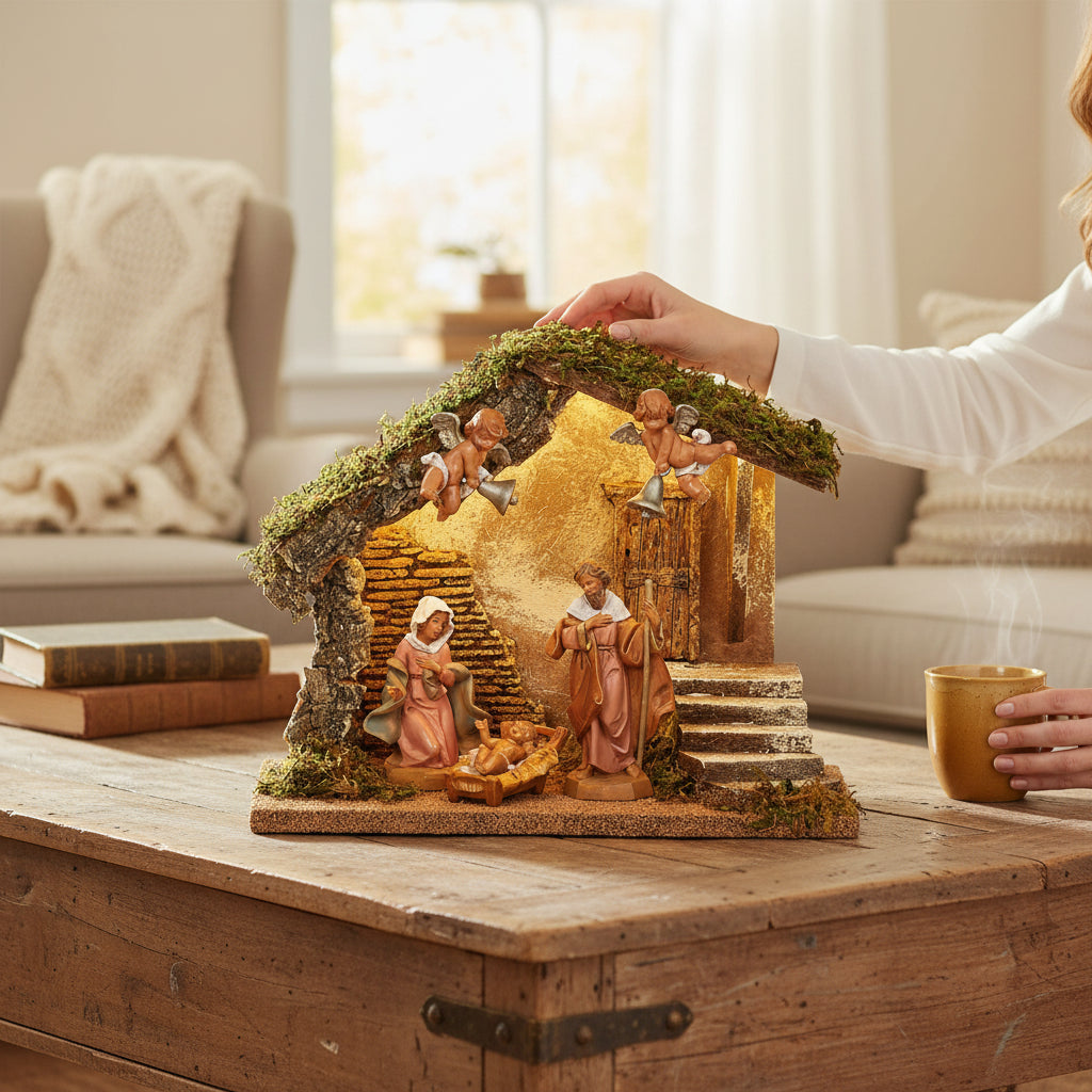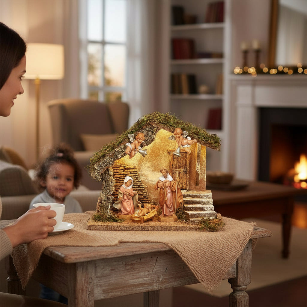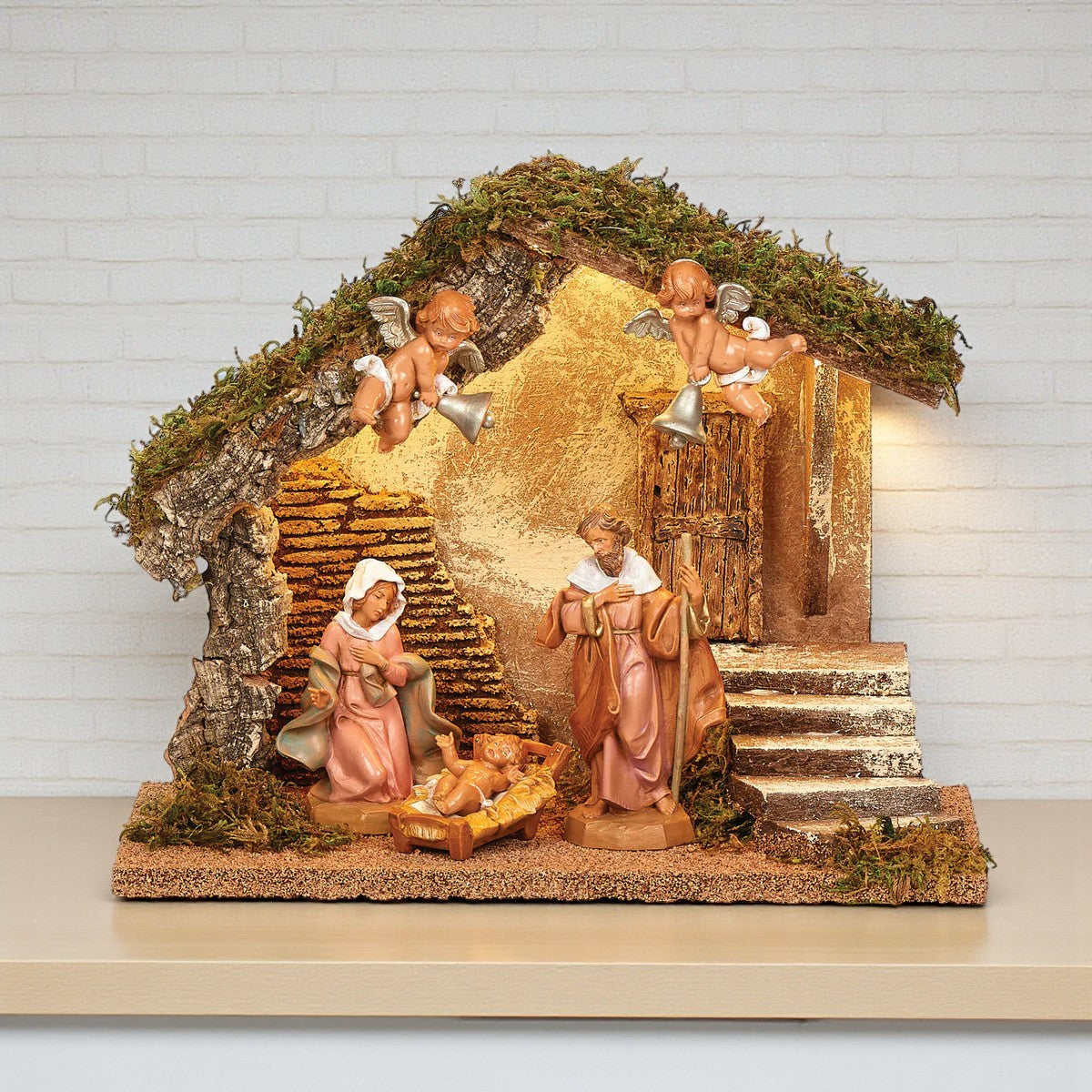 This radiant lighted nativity set includes the Holy Family beneath a rustic Italian stable adorned with three cherubs heralding the newborn King. The soft golden backdrop casts a warm glow over the scene, highlighting the intricate detail of each figure and the moss-covered roof above. With its unique staircase design and joyful angelic accents, this display beautifully symbolizes love, faith, and new beginnings”making it a cherished gift or addition to any collection.