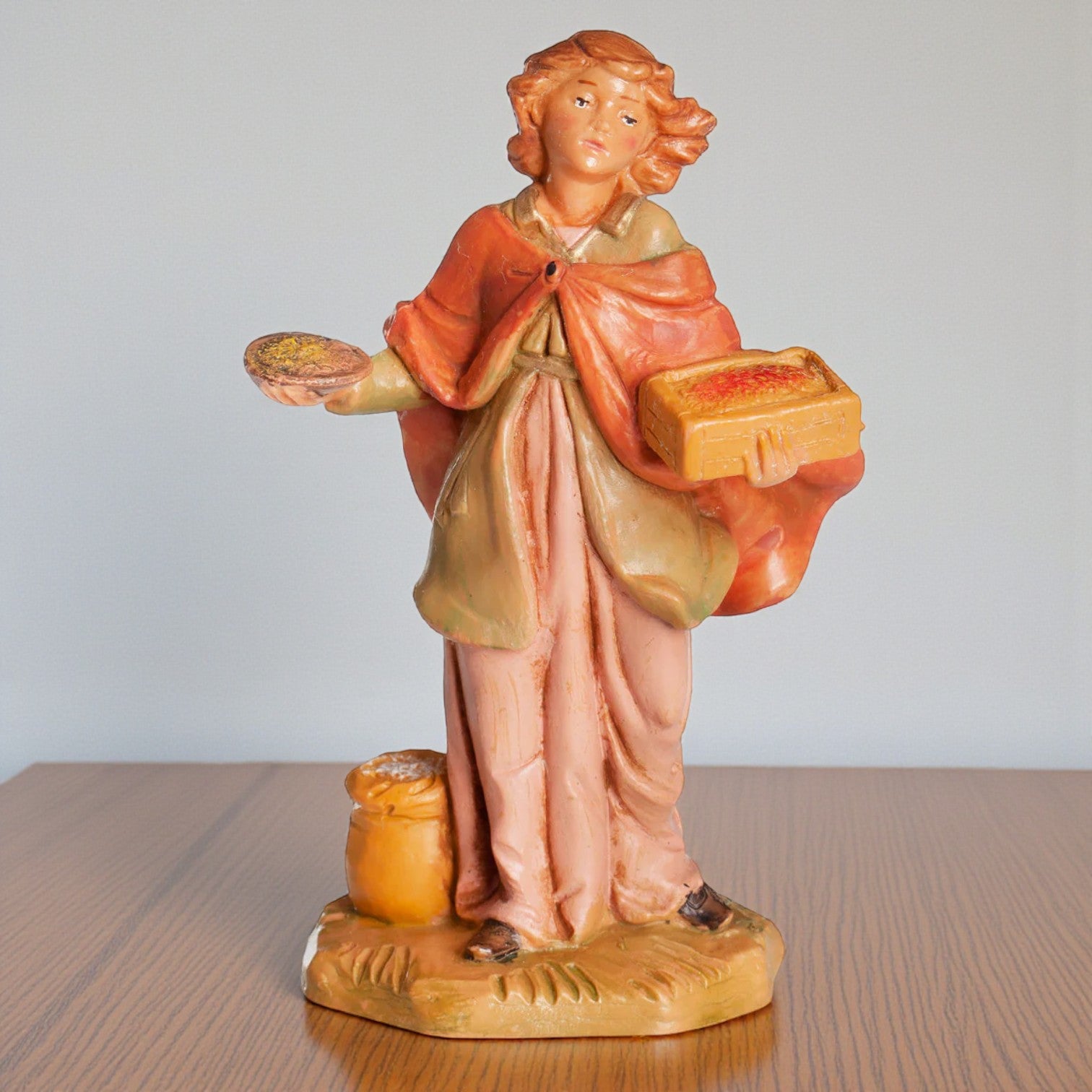 Cassia the Spice Merchant is depicted with a basket in one hand and a box in the other, ready to offer her goods to travelers in Bethlehem. Her journey led her far from home, but here she discovered a hope that she might finally belong. Designed to pair with the Fontanini Spice Cart, Cassia adds depth to the village marketplace and helps bring the story of everyday life into your Nativity.