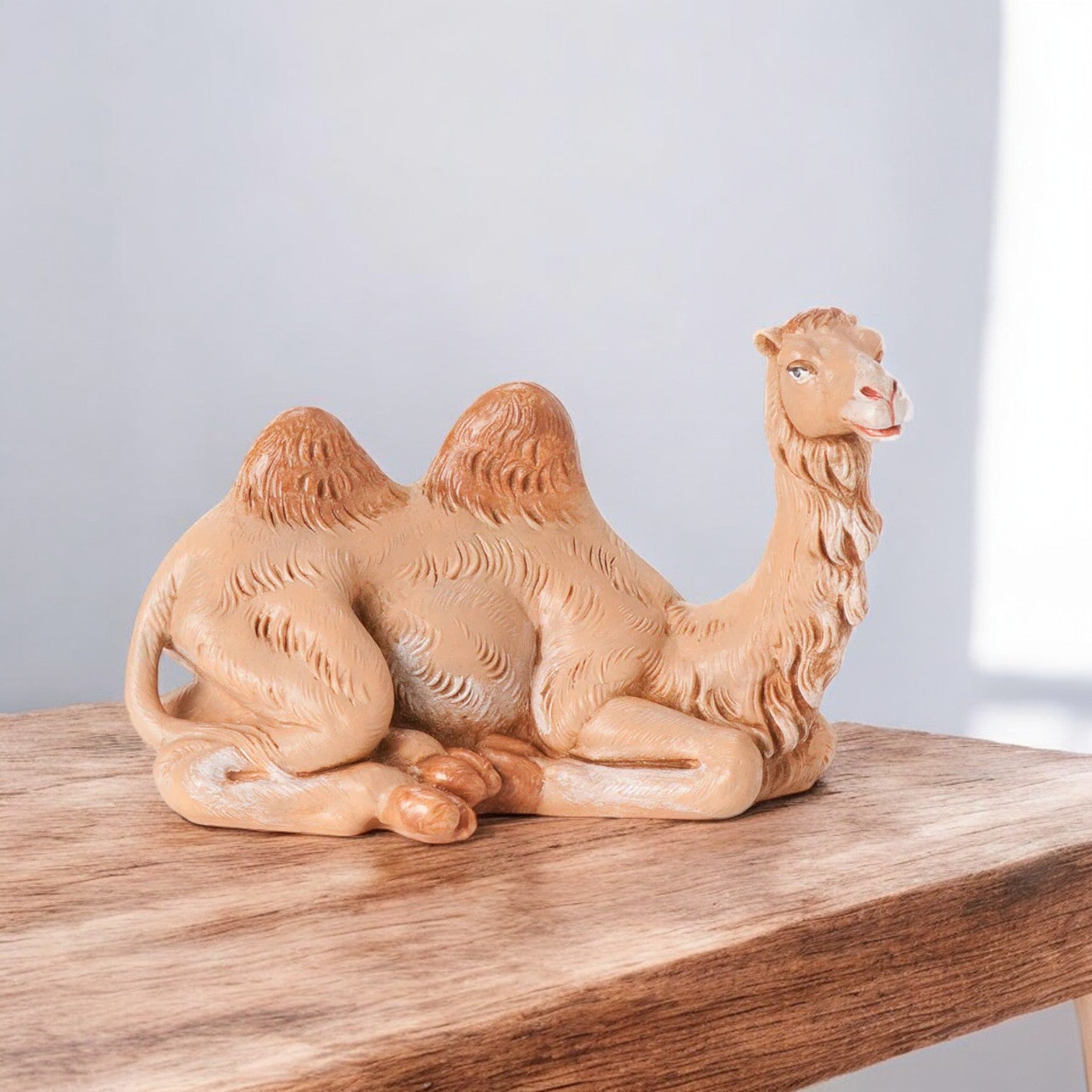 The seated camel by Fontanini brings authenticity and depth to nativity displays, especially those featuring the journey of the Magi. Resting with its legs folded beneath, the figure is finished in warm brown tones with sculpted fur texture and gentle facial detail. A reminder of the long caravan travels that led to Bethlehem, this camel makes a meaningful companion piece to kings, merchants, or desert scenes, enriching your nativity with story and realism.