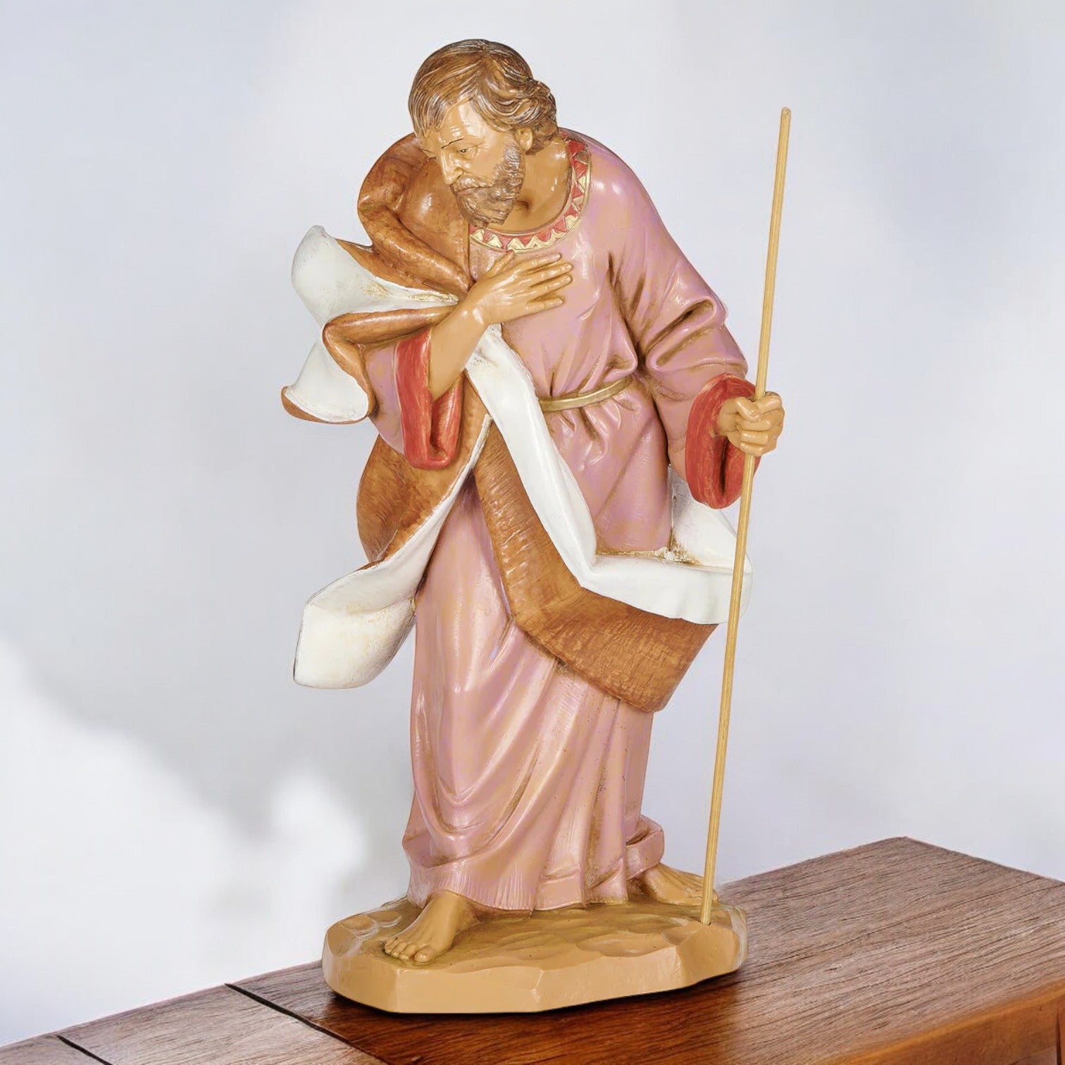 The Joseph Figure reflects the strength and humility of the protector of the Holy Family. Shown standing with staff in hand, his cloak draped over one shoulder, Joseph™s posture conveys both watchfulness and reverence as he gazes toward the Christ Child. Sculpted with lifelike expression and rich detailing, he represents the quiet faith and steadfast care that defined his role in the Nativity