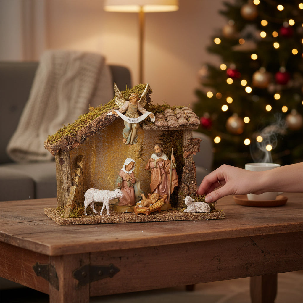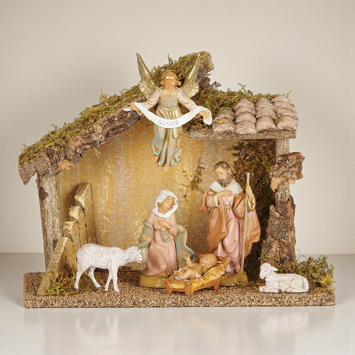 This beautifully composed set includes the Holy Family, a Gloria angel, and two sheep resting peacefully beside the manger. The handcrafted Italian stable features a bark-textured roof with clay tile detail and moss accents, creating a natural and authentic setting for the scene. Every figure is sculpted with lifelike expression and delicate color, reflecting the serenity and reverence of the night Christ was born. A timeless addition to any Christmas collection.