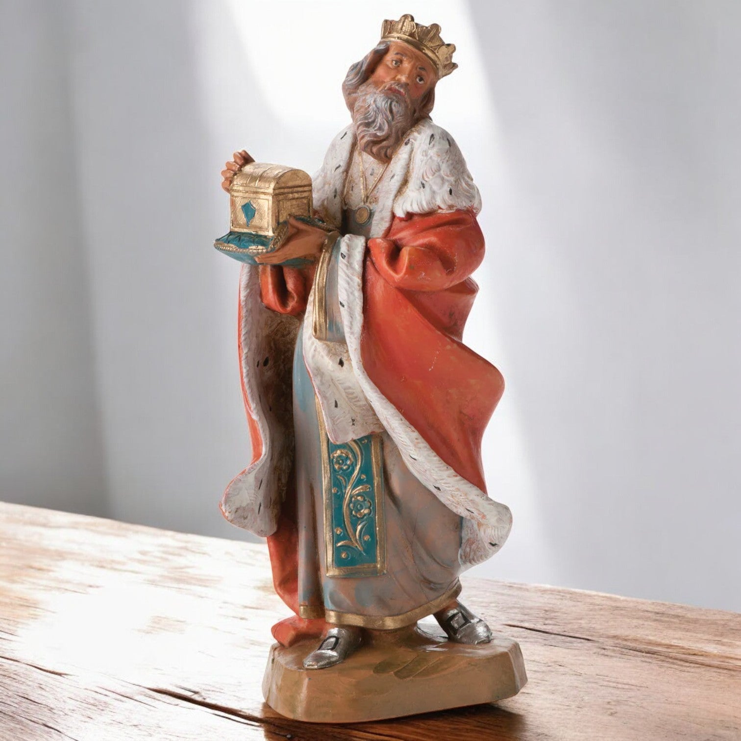 King Melchior, one of the Three Kings, is shown presenting his gift of gold to the Christ Child, a symbol of kingship and honor. is robes are painted in teal and warm earth tones, trimmed with intricate patterns and edged in a fur-like cloak of white and crimson. A key figure in the Epiphany story, Melchior brings majesty and meaning to your Nativity scene, reminding us of the tradition of bearing our best gifts before the Lord.