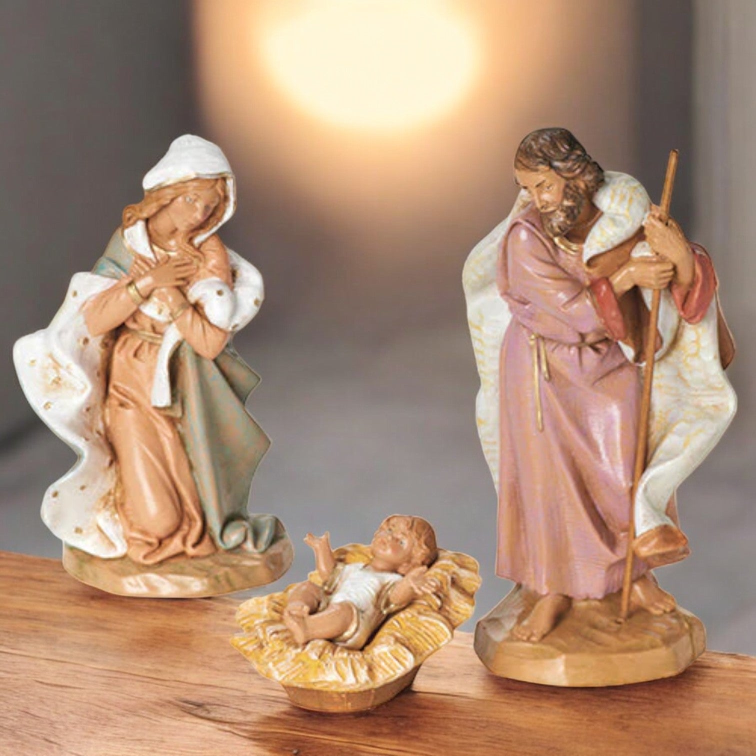This 4-PC Holy Family Set captures the heart of Christmas with timeless beauty. Mary bows in prayer, Joseph stands watchfully with his staff, and the Christ Child rests in a straw-lined manger. The Baby Jesus is removable, allowing you to place Him in the manger on Christmas morning or display the figures together throughout the season. With gentle expressions and finely sculpted detail, this set reflects the love, humility, and devotion of that holy night.