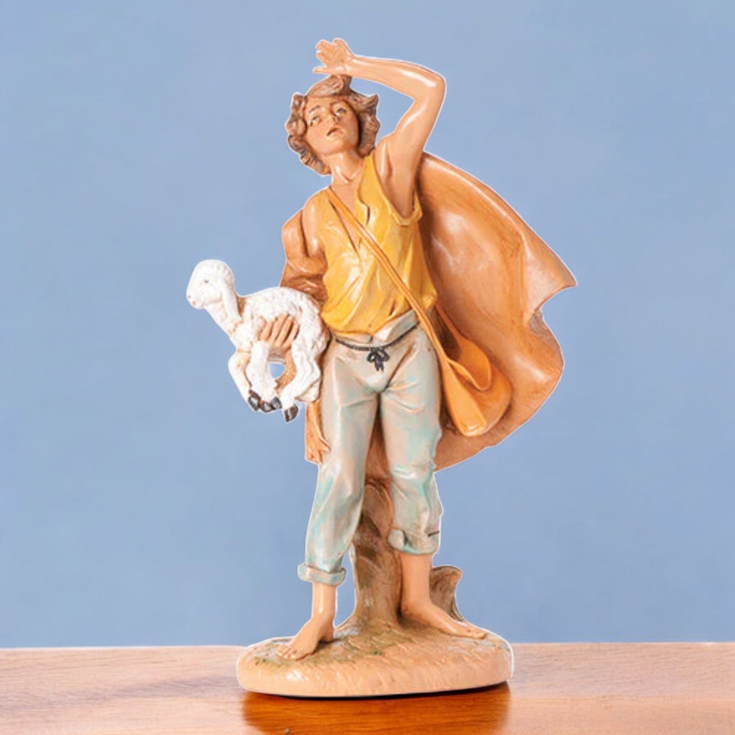 Micah the Shepherd is portrayed shielding his eyes as he gazes toward the brilliant light that broke across the night sky when the angels appeared. In one arm he cradles a lamb, representing both his devotion as a shepherd and the gift he would bring to the manger. His figure tells the story of that holy night, when humble men were the first to hear the news of the Savior™s birth and responded with awe and faith.