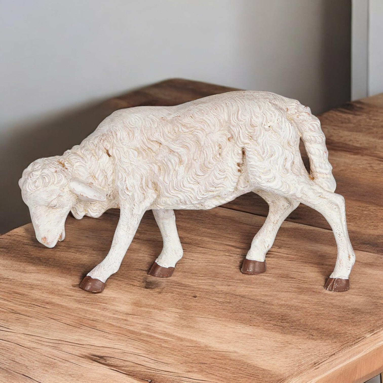This sheep by is sculpted with its head lowered, capturing the natural stance of grazing. Its creamy white coat is detailed with textured wool and a subtle curve in posture, designed to blend seamlessly with other Fontanini figures. A versatile piece for shepherd groupings or livestock settings, it brings lifelike presence and authenticity to your nativity collection.