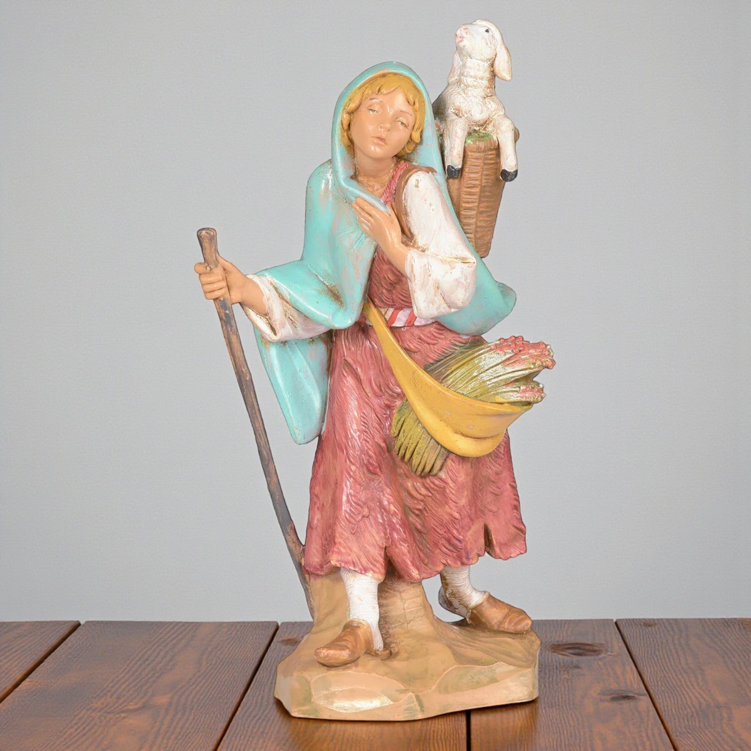 Bring Miriam into your nativity and let her story of courage and compassion shine. With a shepherd™s staff in hand and a lamb nestled in the basket on her back, she reflects the care and devotion of those who first welcomed the Savior.Her figure invites you to imagine the humble faith of those who came with only love and service to offer.