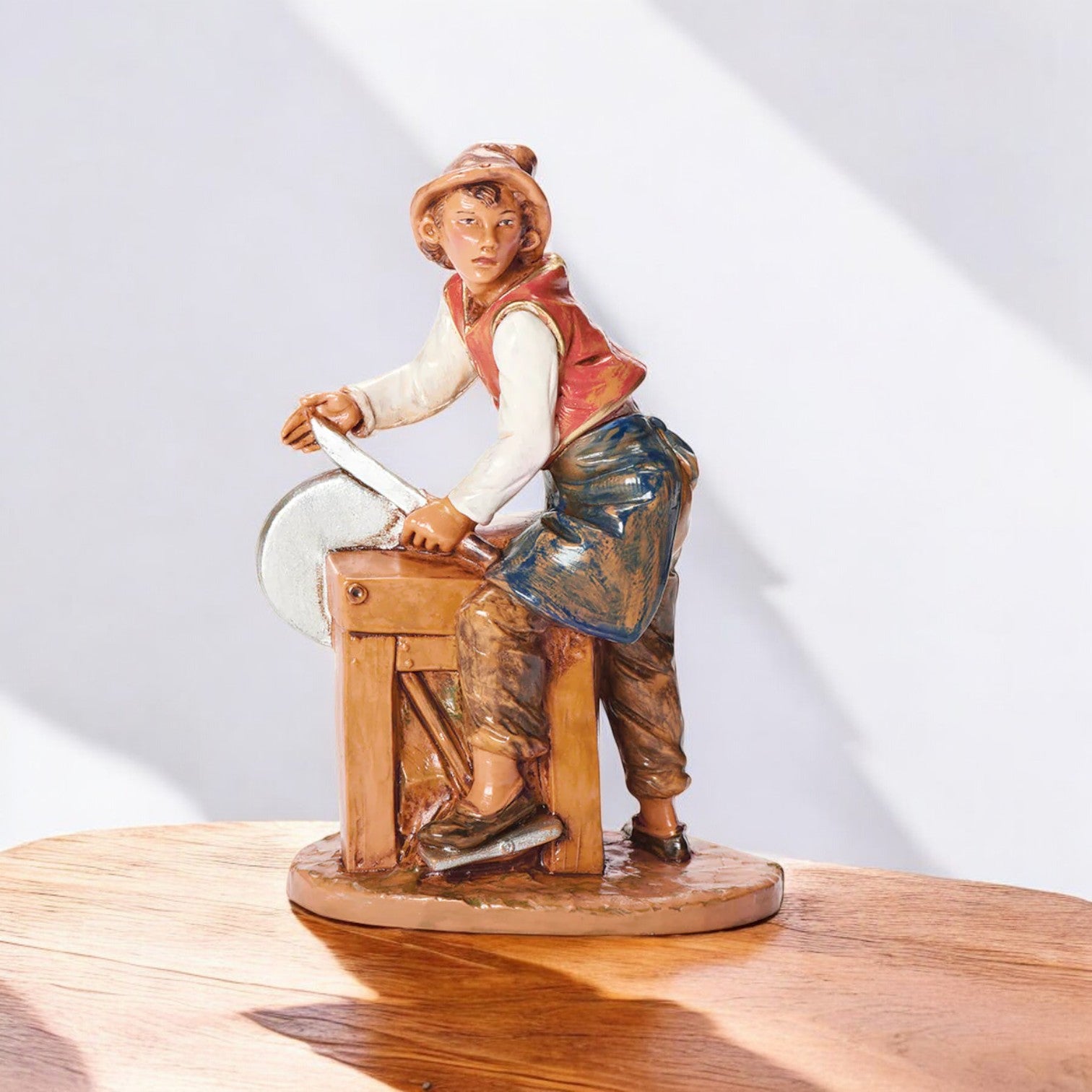 The 5" Scale Silvanus Knife Sharpener by Fontanini adds a unique touch of artisanal heritage to your nativity or village display. This detailed figure depicts Silvanus in the act of sharpening a knife, a skillful workshop accessory that evokes the vibrant atmosphere of ancient marketplace trades. With a focused expression and carefully sculpted tools, this figure is ideal for enriching a busy workshop scene or adding authenticity to market setups.