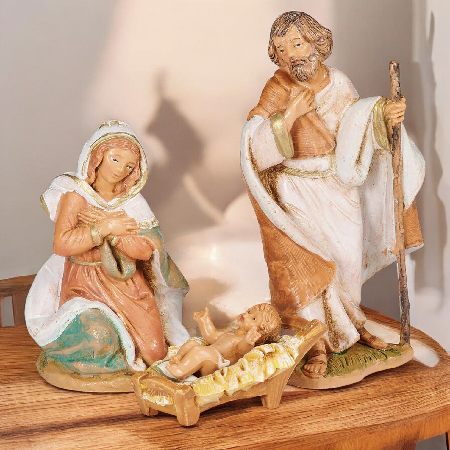 This 3-PC Holy Family Set beautifully depicts the heart of the nativity, with Mary in prayer, Joseph standing protectively with his staff, and Baby Jesus resting in a manger. The figure of Jesus is removable, allowing you to place Him in the scene on Christmas Day for a meaningful tradition. A timeless centerpiece for your nativity.