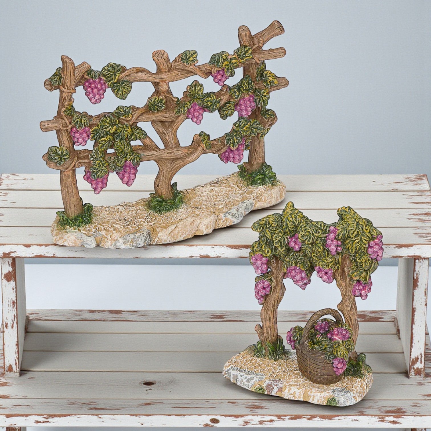 This 2-PC vineyard fence set brings a colorful, rustic accent to your nativity village or marketplace scene. With grapevines climbing wood-textured fencing and clusters of purple grapes tucked among sculpted green leaves, this set creates the look of a bountiful harvest. One section includes a basket brimming with grapes, perfect for pairing with market figures or produce workers.