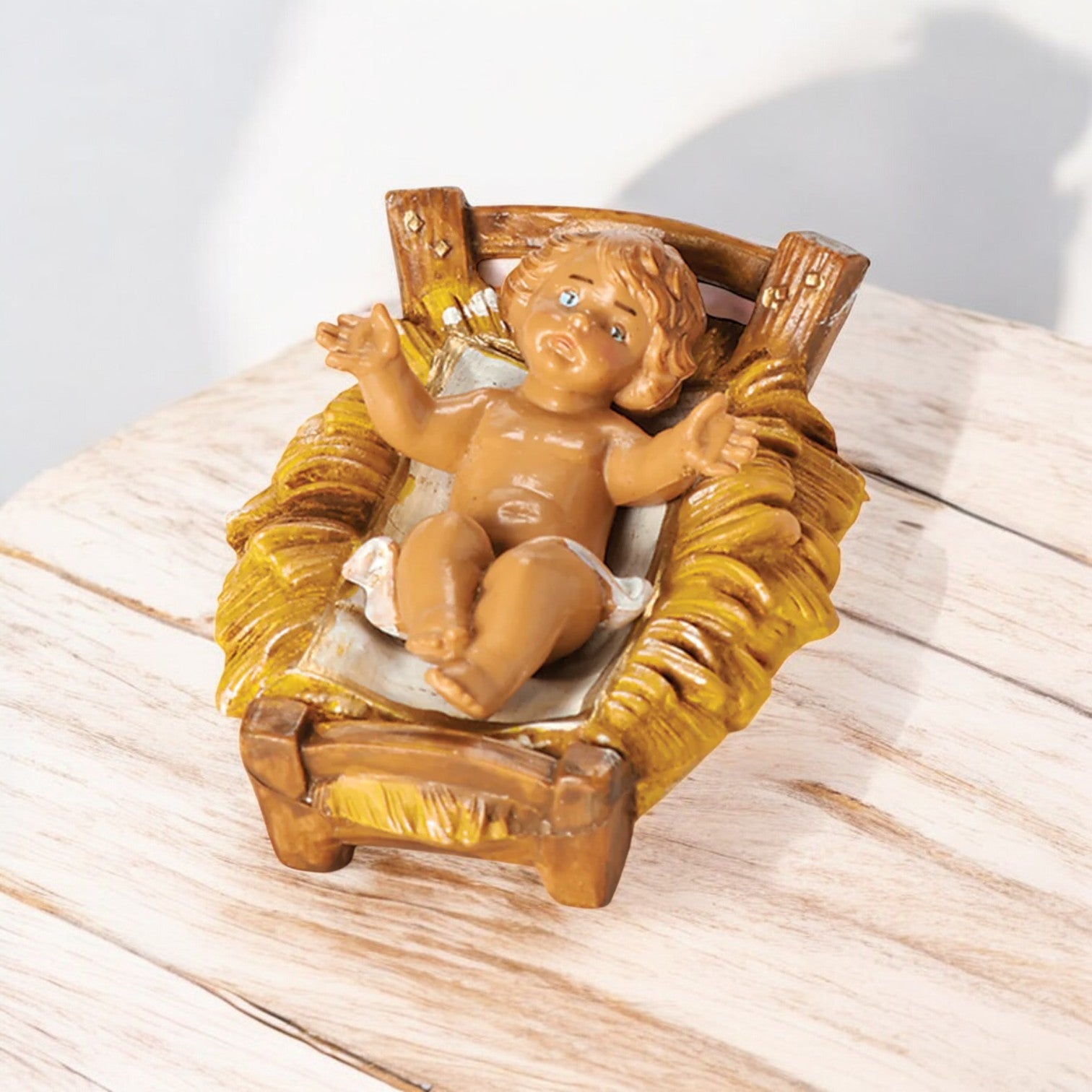 This Baby Jesus by Fontanini represents the true heart of the nativity. This finely detailed figure features the infant Jesus lying in a wood-like manger with sculpted straw texture. The removable baby is ideal for meaningful Christmas Day moments or family traditions. As part of the Classic Holy Family, this piece carries the timeless artistry and reverence Fontanini collectors appreciate.