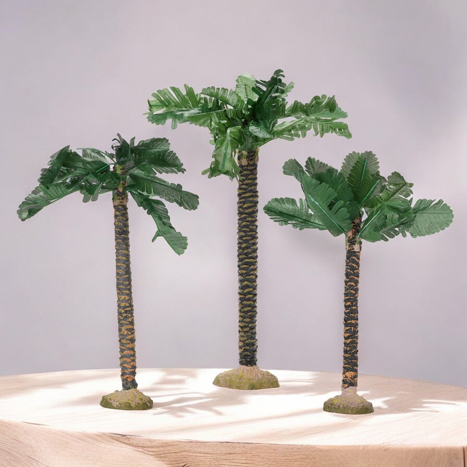 This 3-PC palm tree set adds height, texture, and authentic Middle Eastern detail to your nativity village. Each tree features a tall, textured brown trunk and lush green fronds that spread outward to create natural shade and dimension. Arrange them beside buildings, along pathways, or near the stable to frame your scene and give it a more realistic setting. With three sizes included, these palms bring variety and balance, making your nativity display feel complete and full of life.