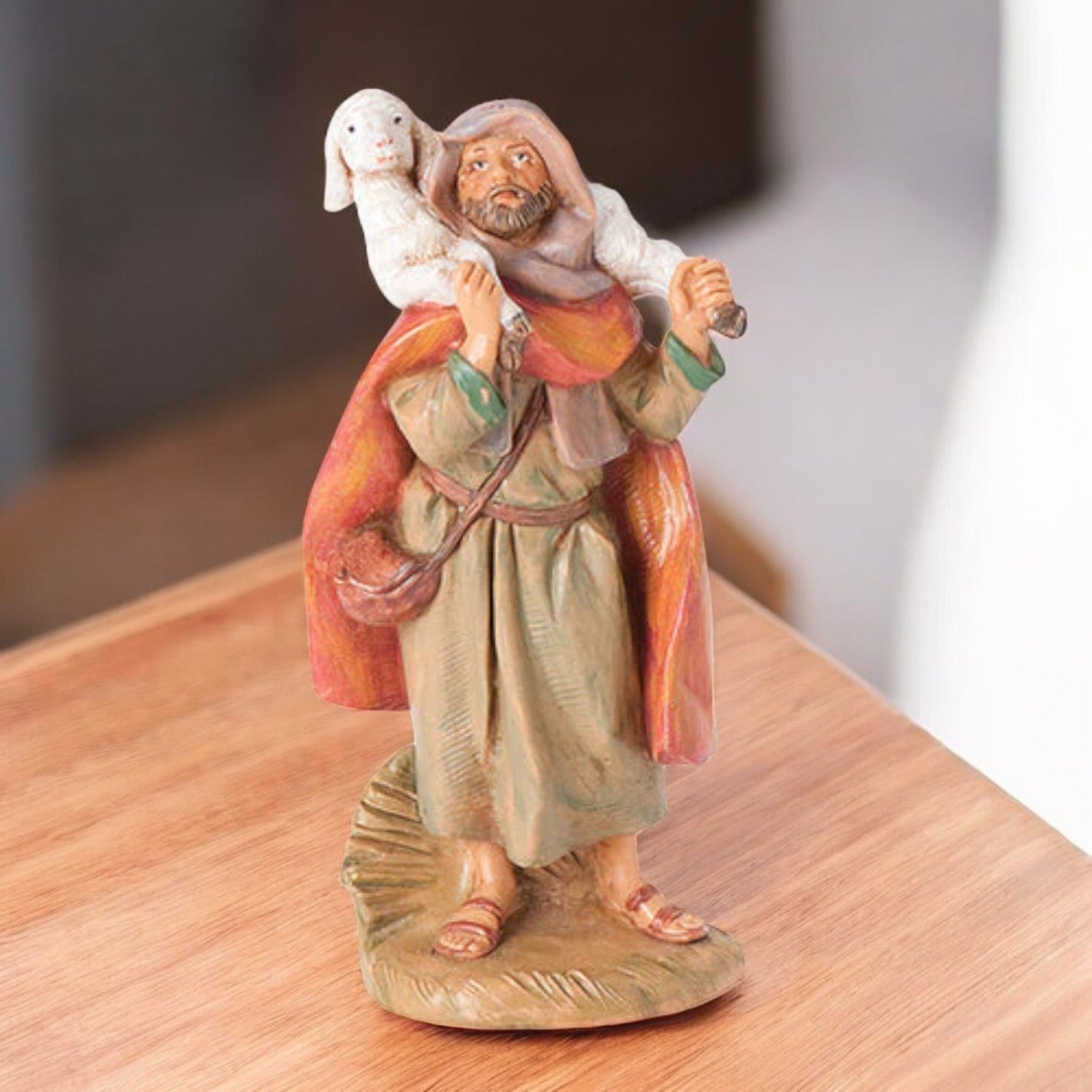 Matthew by Fontanini portrays a shepherd returning with a lamb draped across his shoulders, a symbol of both protection and faith. Sculpted with a flowing tan robe, red cloak, and satchel at his side, he looks upward as if still recalling the heavenly message he witnessed in the fields of Bethlehem. This figure captures the moment of rescue and the greater story of being led to the Savior.