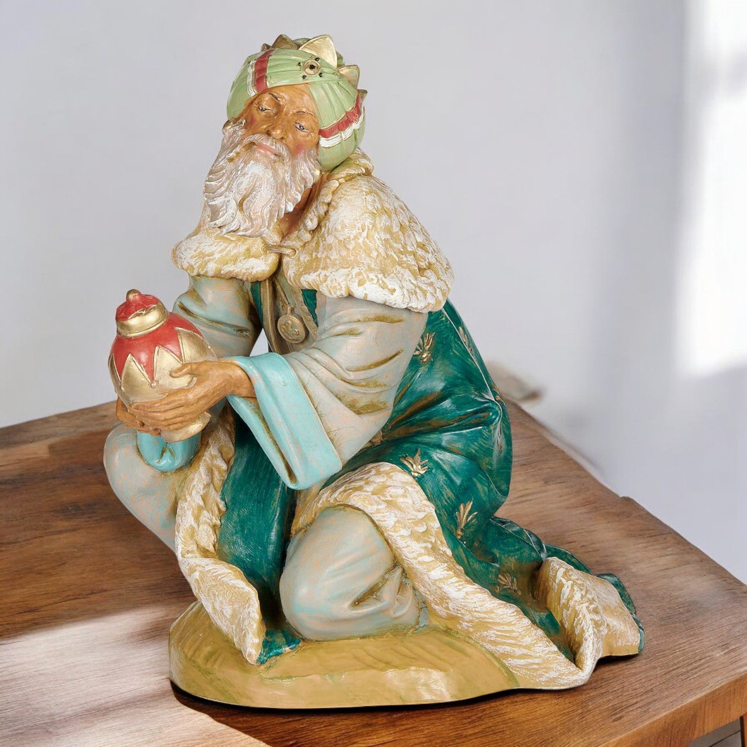 King Gaspar, one of the Three Kings, is honored as the bearer of frankincense”an offering that symbolized prayer and divinity. This figure depicts Gaspar kneeling in reverence, holding his gift with both hands as he presents it to the Christ Child. His flowing green robe with golden trim and fur-lined mantle conveys royal dignity, while his bowed posture reflects humility before the newborn King.