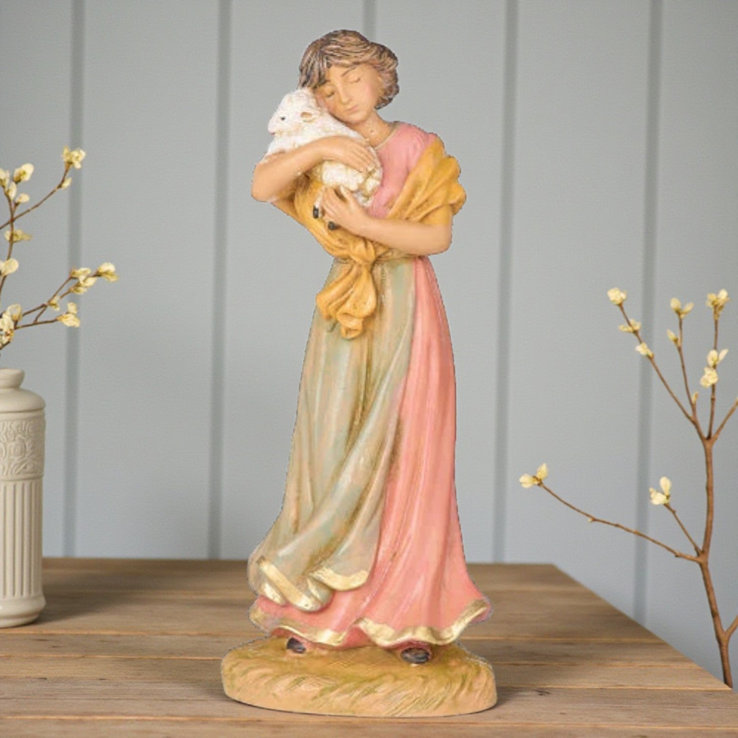 Maia is depicted as a young woman with brown hair and downcast eyes, gently cradling a fragile lamb. Her flowing rose and sage robes with gold trim reflect both beauty and strength, while her story recalls the days she cared for every lamb with devotion. When her husband brings her a newborn she names Hope, Maia rediscovers faith and joy. A meaningful addition to your nativity, she brings renewal and depth to any collection.