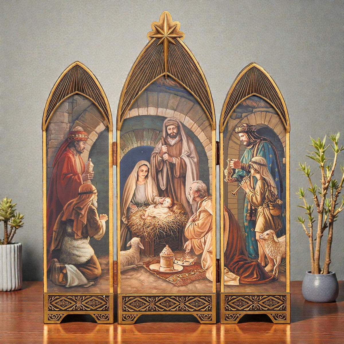 This elegant Nativity folding screen by Joseph™s Studio captures the reverence and beauty of that first Christmas night. The center panel features the Holy Family beneath the arch of the stable, surrounded by shepherds and wise men offering their gifts. Framed in rich gold detailing with intricate filigree patterns, each hand-painted panel is alive with depth, color, and emotion. Crafted with a hinged design, this freestanding piece folds easily for display or storage.