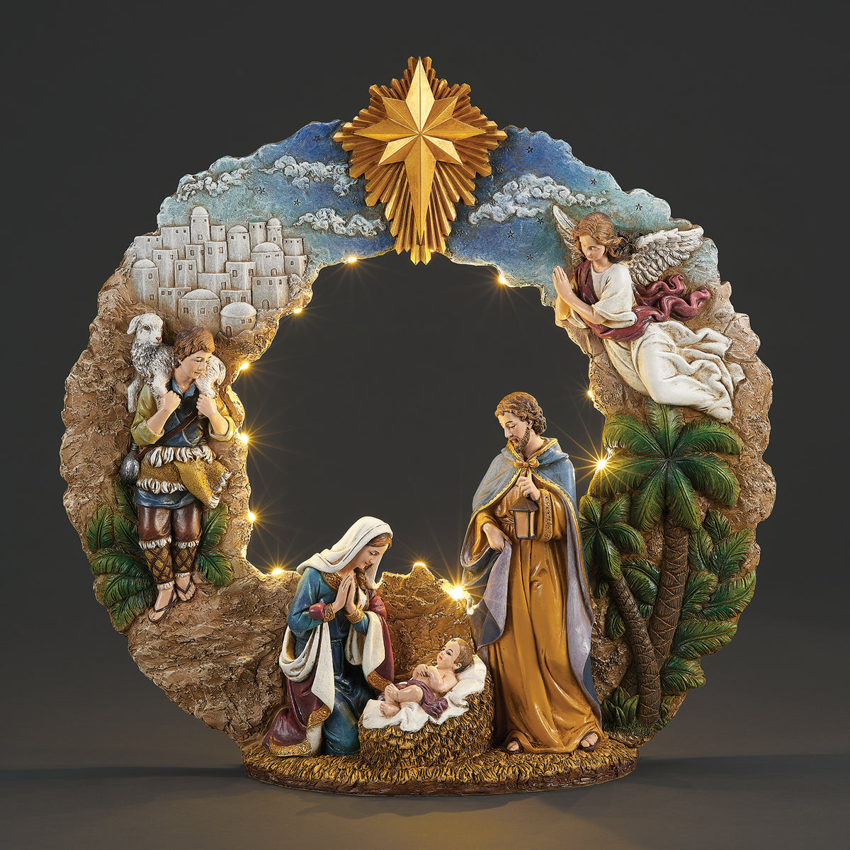 From the Joseph™s Studio Collection, this lighted nativity wreath beautifully frames the Holy Family with a celestial arch of clouds, angels, and the town of Bethlehem. Illuminated by a glowing star above and gentle lights throughout, it brings warmth and reverence to any space. Crafted from resin, it™s perfect for wall or tabletop display.