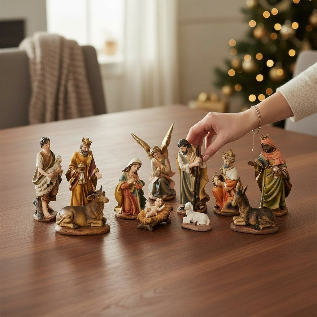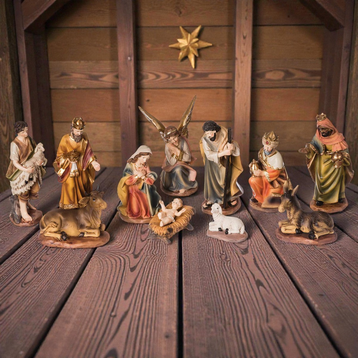 This 11-piece nativity set features a vintage color-washed finish that gives each figure a timeless, hand-painted look. At the center, Joseph leans protectively over Mary and the Christ Child. The angel™s golden wings shine as she kneels in prayer, while the shepherd holds his lamb close. The Three Kings add richness with sculpted robes and gifts, and the ox, donkey, and sheep bring the humble spirit of the stable. With its expressive details and classic styling, this set offers a warm and distinctive way to honor the first Christmas.