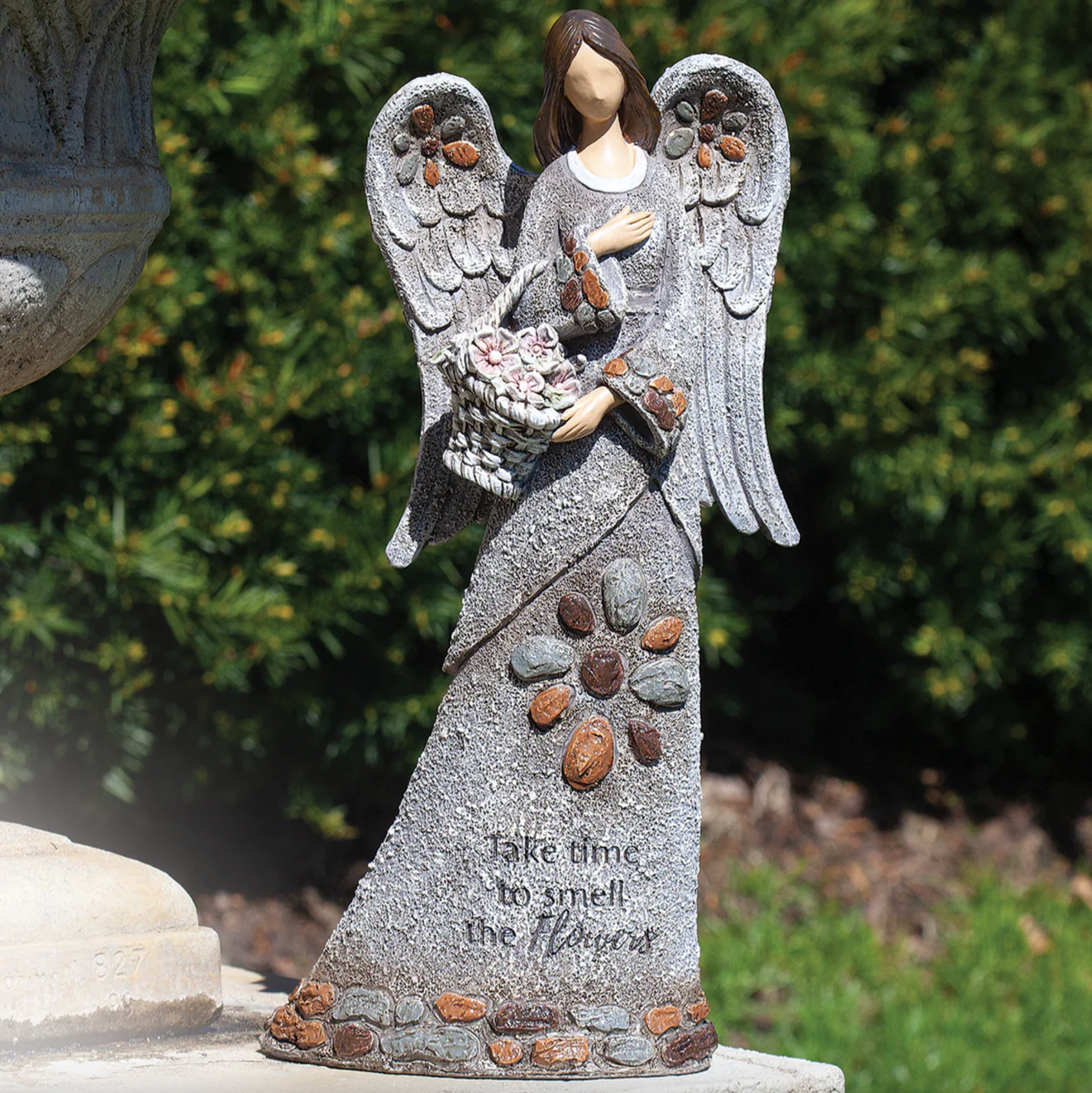 Bring peaceful beauty and inspiration to your space with the Take Time to Smell the Flowers Angel Statue. Crafted with exquisite attention to detail, this graceful angel features a soft stone-like texture and delicate floral accents that evoke timeless serenity. Cradling a basket overflowing with blooms, she carries a gentle reminder etched into her design: "Take time to smell the flowers." Whether displayed in a garden sanctuary, on a welcoming patio, or in a quiet corner indoors, this statue serves as a heartfelt symbol of faith, gratitude, and the beauty found in life's simple moments.