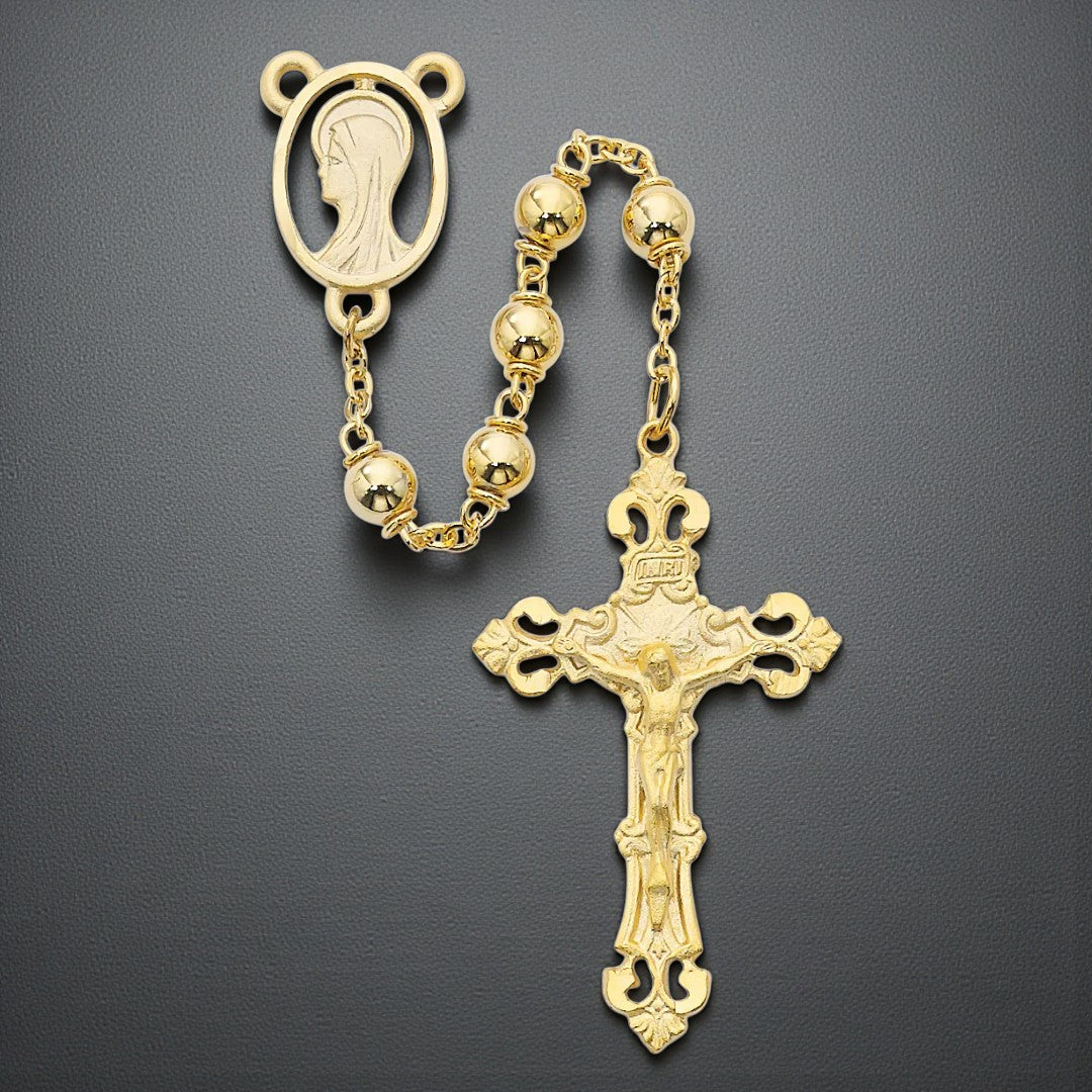 6mm gold plated metal beads with gold plated pewter center and crucifix. Deluxe gift boxed.