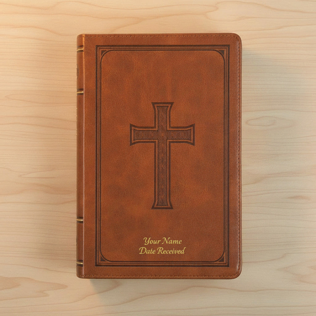 The Honey-brown Faux Leather King James Version Deluxe Gift Bible with Thumb Index combines timeless elegance with enduring spiritual beauty. This red-letter edition showcases the beloved poetic language of the KJV translation in a presentation-quality format designed for gifting. Wrapped in rich honey-brown faux leather with a gracefully debossed Celtic cross, gilt-edged pages, and convenient thumb indexing, this Bible is a treasured keepsake that honors both faith and craftsmanship. Whether presented for a milestone celebration, a Father's Day tribute, or a Christmas blessing, this personalizable edition becomes a cherished companion for daily devotion and a lasting symbol of God's Word.