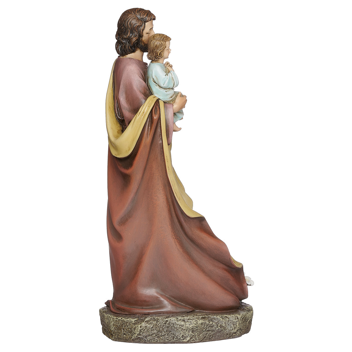 This St. Joseph figure with the Child Jesus offers a peaceful and devotional presence to any prayer space or home. Crafted in resin with rich, hand-painted detail, it features a built-in candle holder designed to hold a standard pillar candle (not included). The base is adorned with liliesš a classic symbol of purity and St. Joseph's loving guardianship. Perfect for altars, bedside prayer corners, or memorial lighting.