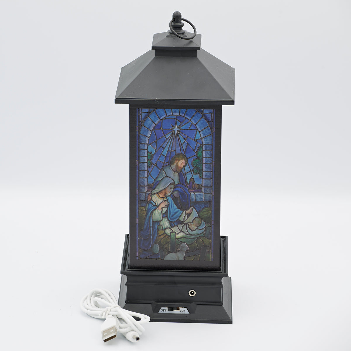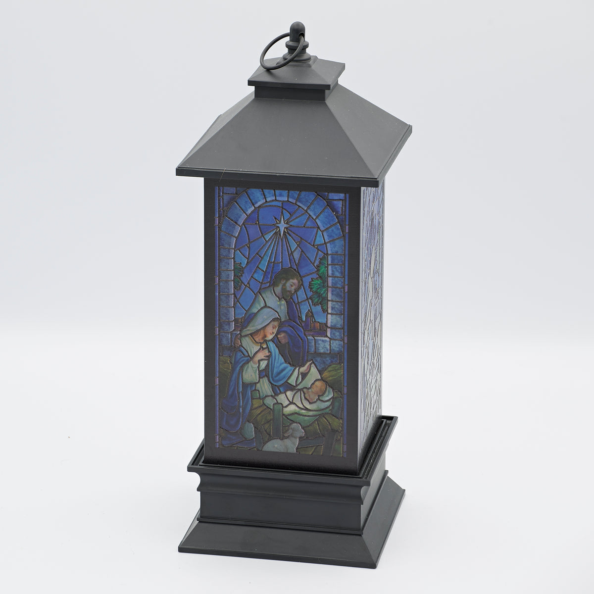This lighted swirl lantern features a stained glass-style depiction of the Holy Family. Swirling glitter and radiant light enhance the vibrant details, creating a timeless and reverent Christmas accent.