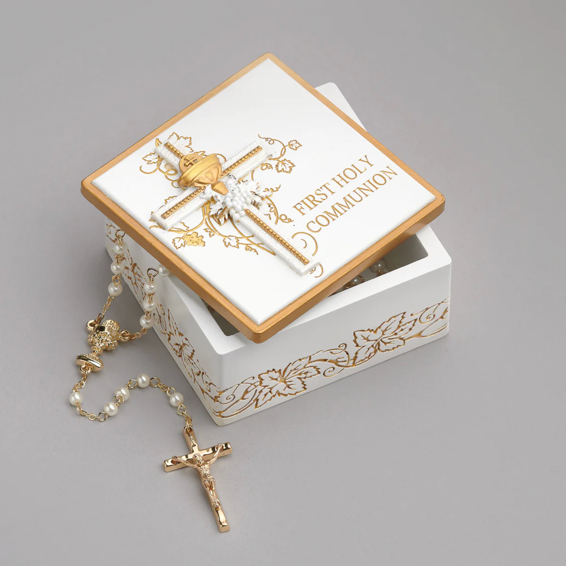 Celebrate one of life's most sacred milestones with this exquisite First Communion Keepsake Box from Joseph's Studio by Roman. Beautifully crafted with reverent detail, this elegant box features a gleaming gold chalice design that honors the Blessed Sacrament. The perfect vessel to preserve precious mementos from this holy day, from rosaries and prayer cards to photographs and certificates, this keepsake box becomes a treasured heirloom that keeps the memory of your child's First Holy Communion alive for years to come.