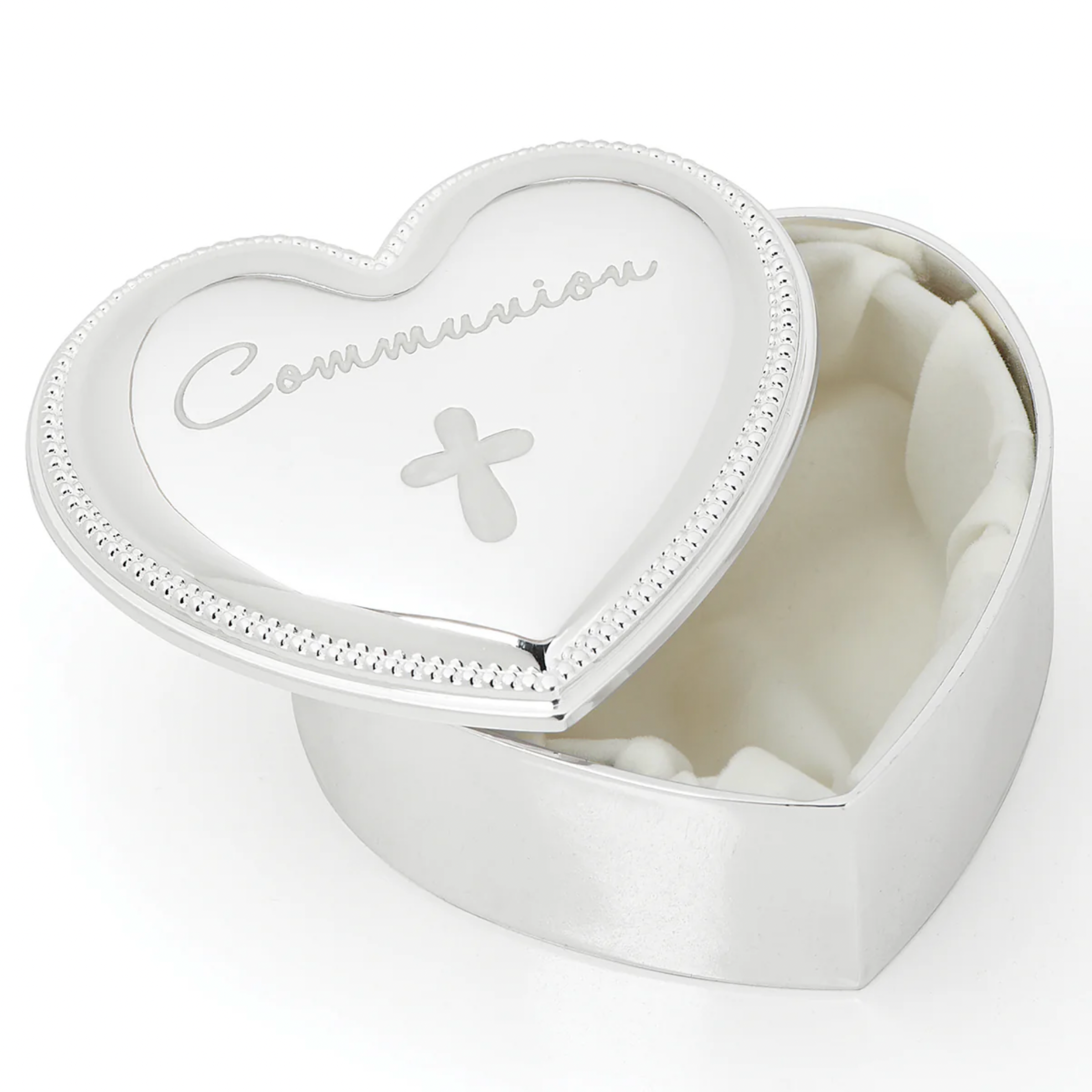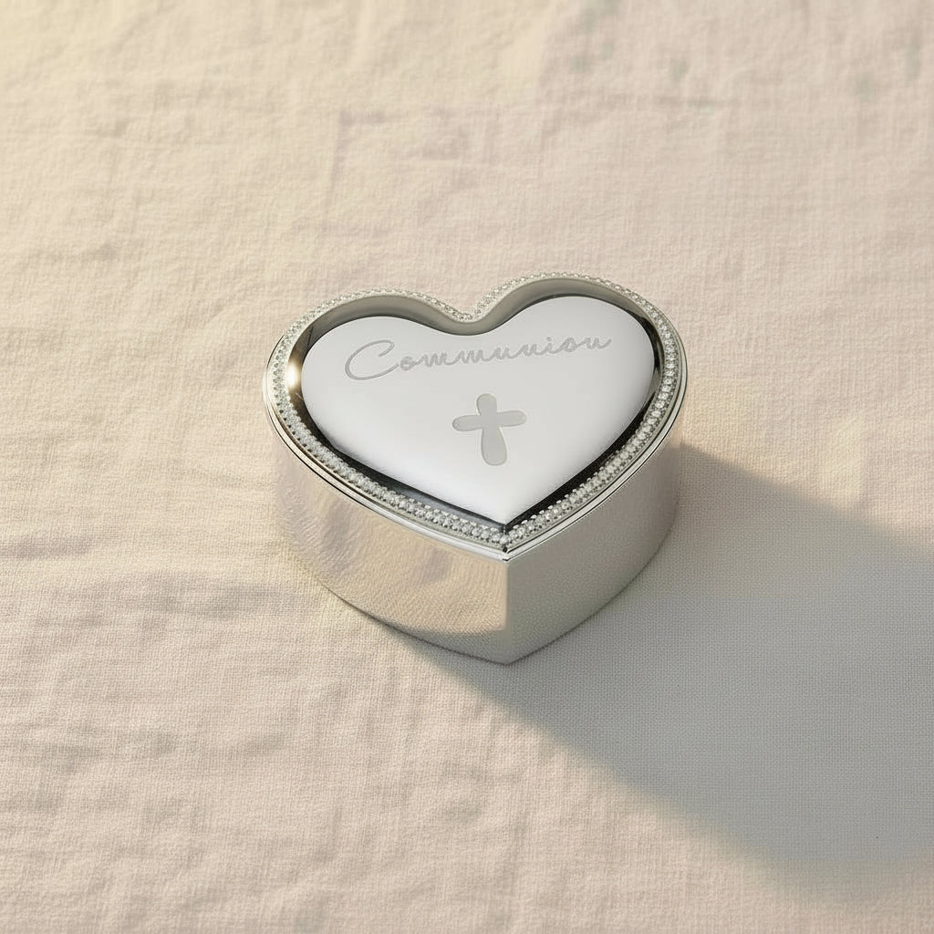 This exquisite heart-shaped First Communion keepsake box from Roman's Caroline Collection is a treasured way to preserve the sacred memories of this special sacramental milestone. Crafted with a silvery, reflective finish that catches the light beautifully, this elegant 2.5-inch box provides the perfect home for a cherished rosary, prayer card, or other small mementos from your child's First Holy Communion day. The timeless heart design symbolizes God's love and makes this keepsake a meaningful gift that families will treasure for generations.