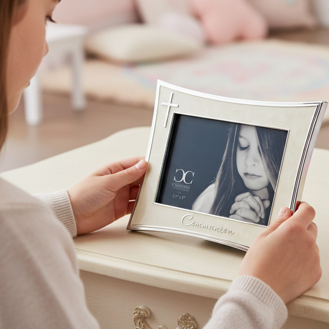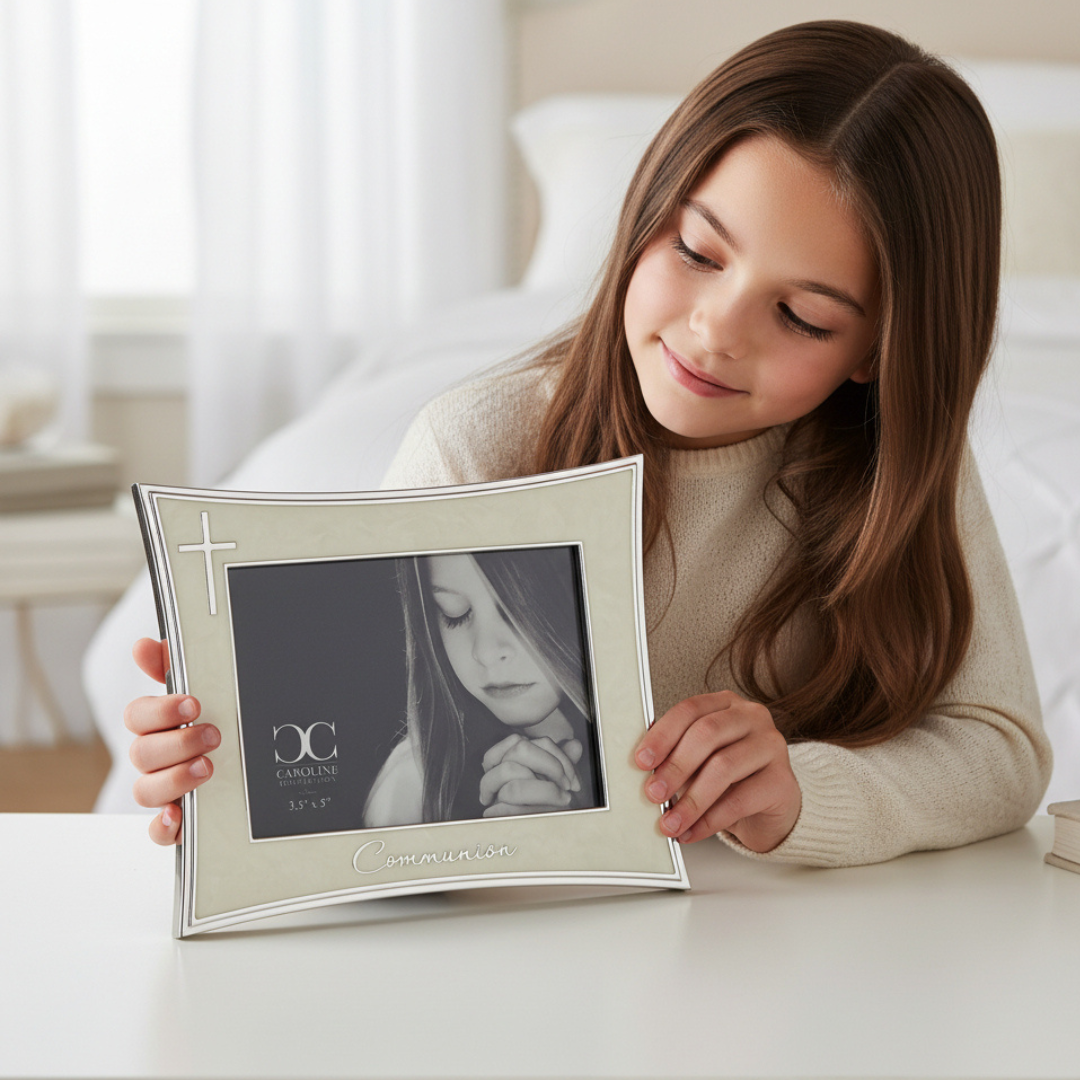 Celebrate this sacred milestone with a beautiful keepsake that honors the joy and significance of a child's First Holy Communion. This elegant ivory frame from the Caroline Collection by Roman features a delicate silver cross design, creating a timeless display for cherished memories of this special day.