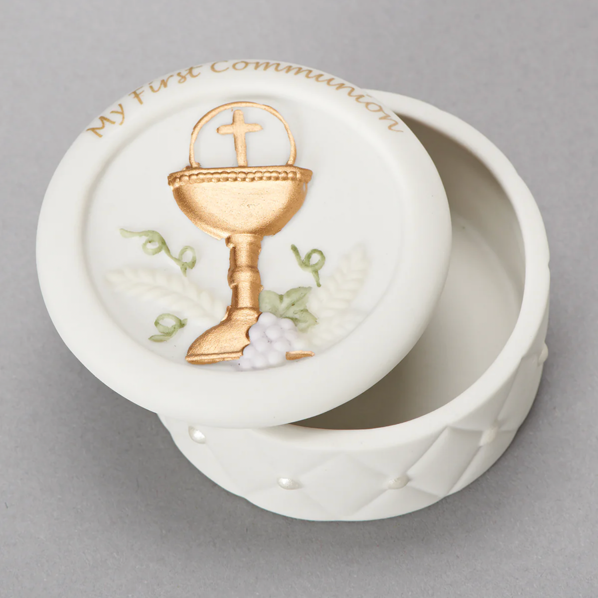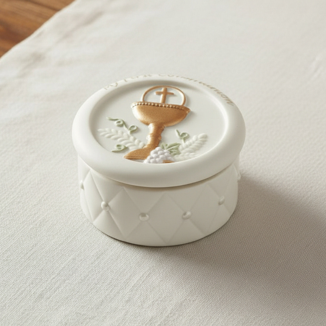This exquisite, quilted porcelain keepsake box is a treasured way to preserve the sacred memories of a child's First Holy Communion. Crafted by Roman with meticulous attention to detail, this elegant box features a beautifully quilted surface adorned with delicate pearl-like accents. The pristine white finish and compact 1-inch height make it a perfect vessel for storing a rosary or other cherished mementos from this milestone sacrament.